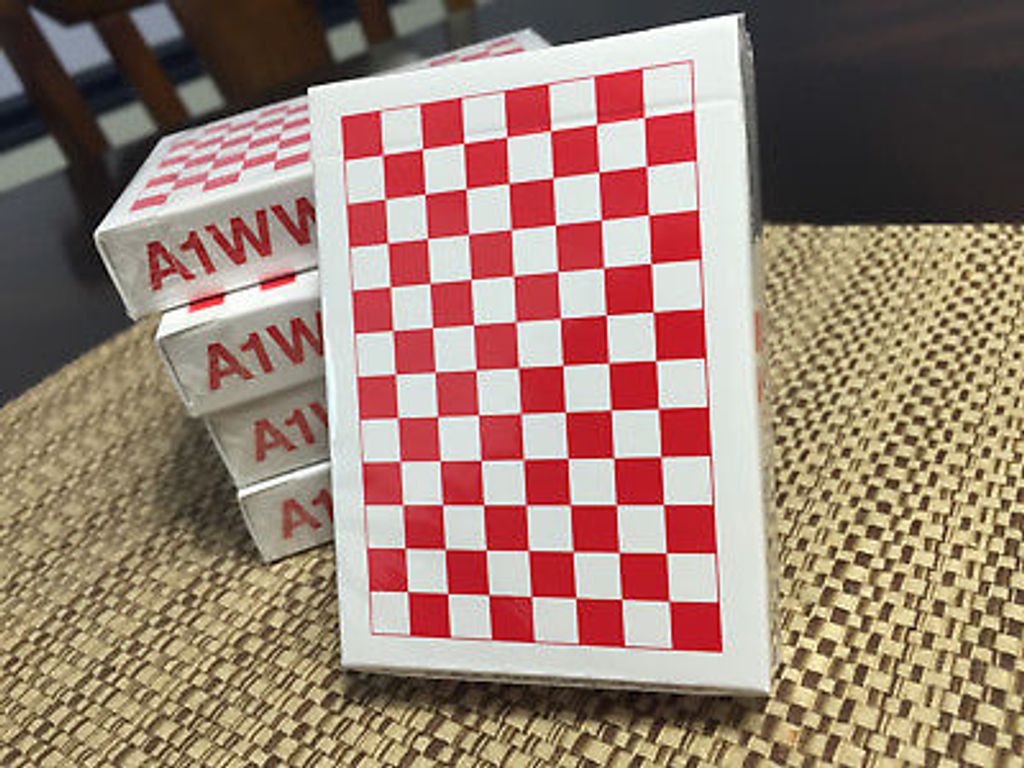 Each box contains one complete set of 52 playing cards with a red/white checkered design. Printed on squeezed paper stock for slick handling with a slightly embossed cross-hatch linen finish
