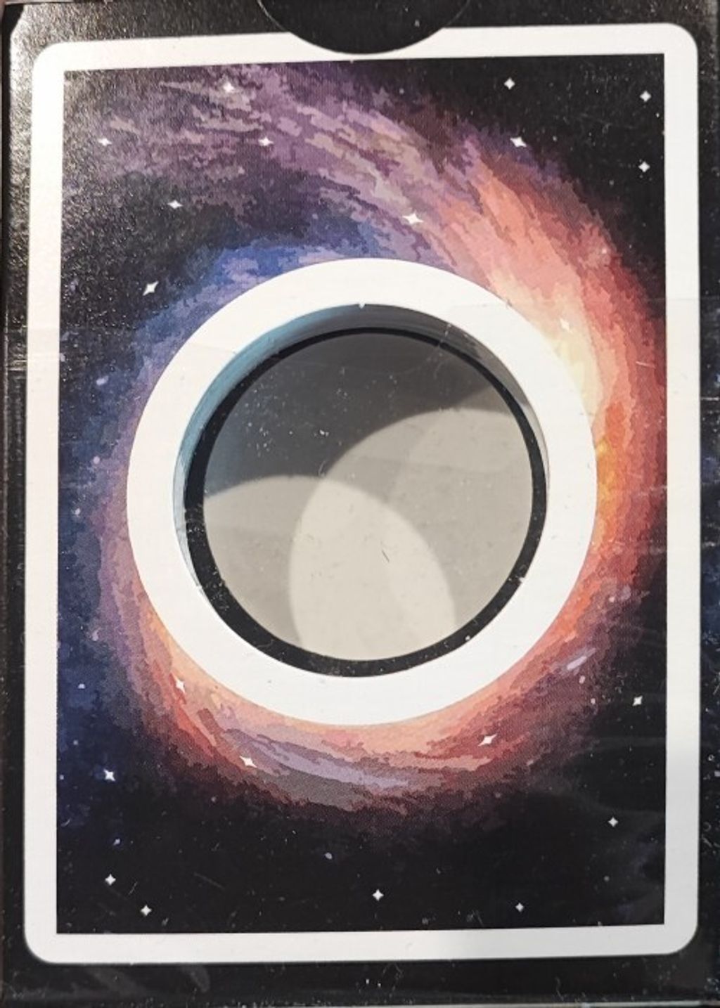 From the 2017 mind of Joe Feldpausch comes the Black Hole Edition Orbits! Joe and I have been talking about this idea for years but never found a proper way to accomplish what we wanted so we shelved it. 7 years later, we found a way to bring his idea to life and turned it into a polished final product with the help of my other half, the legend himself, Daniel Schneider on the artwork.The cards were printed at Cartamundi and have been in pre-production for over a year now. It took a lot for us to get to this point. The hole is the exact dimensions of the inside of our signature Orbit O on the back design. All the card faces are warped around the Black Hole.