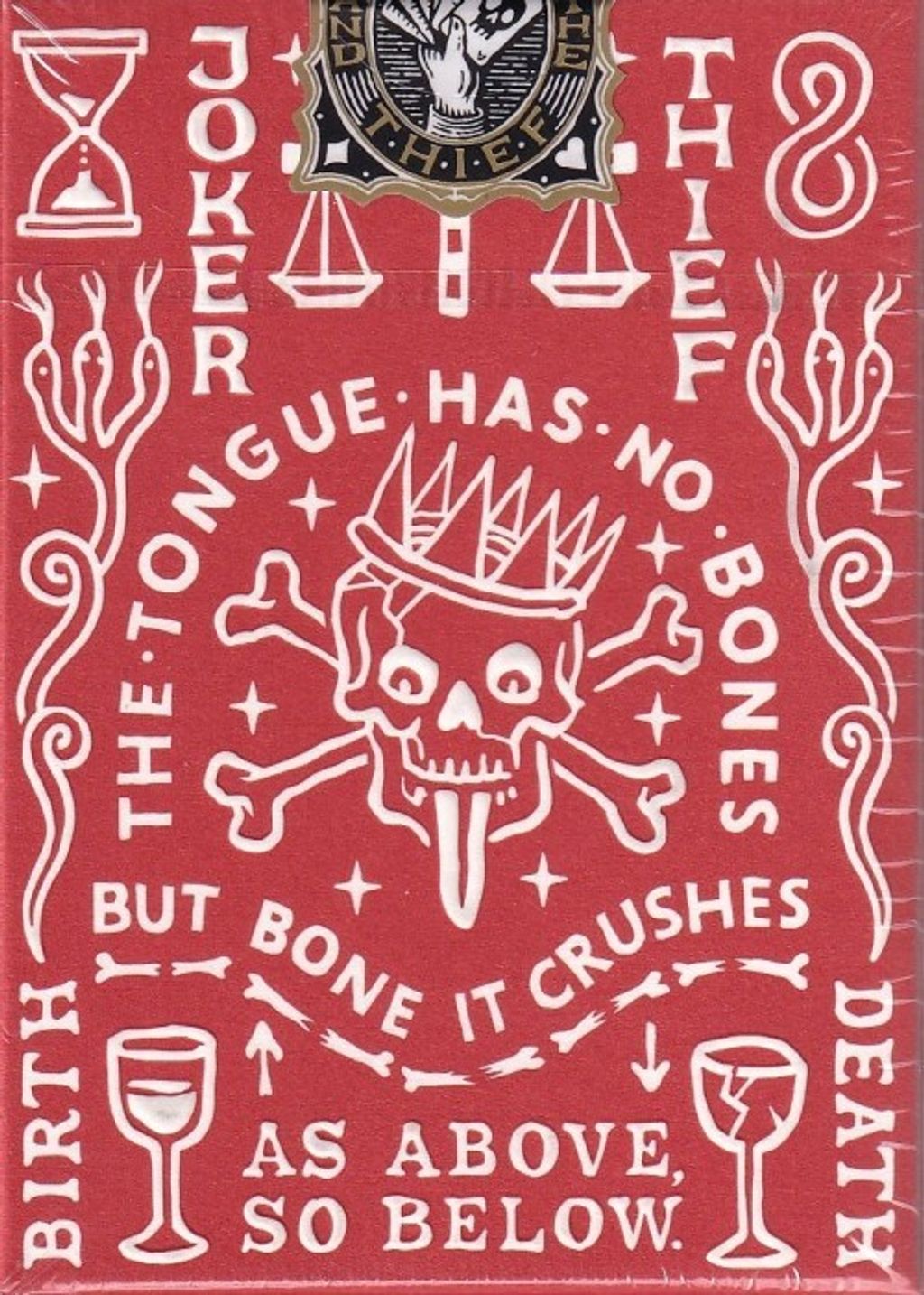 Made with premium paper stock, and a finish that allows the cards to effortlessly glide. All housed in a beautiful tuck box with heavy embossing on the design elements. Sealed with our foil, Joker and the Thief manufacturer seal.