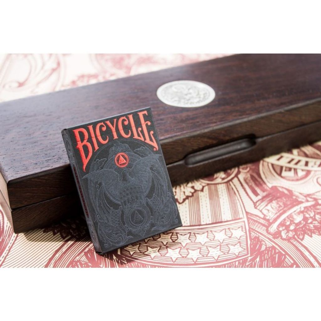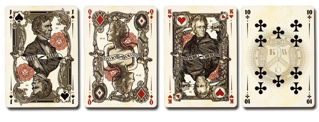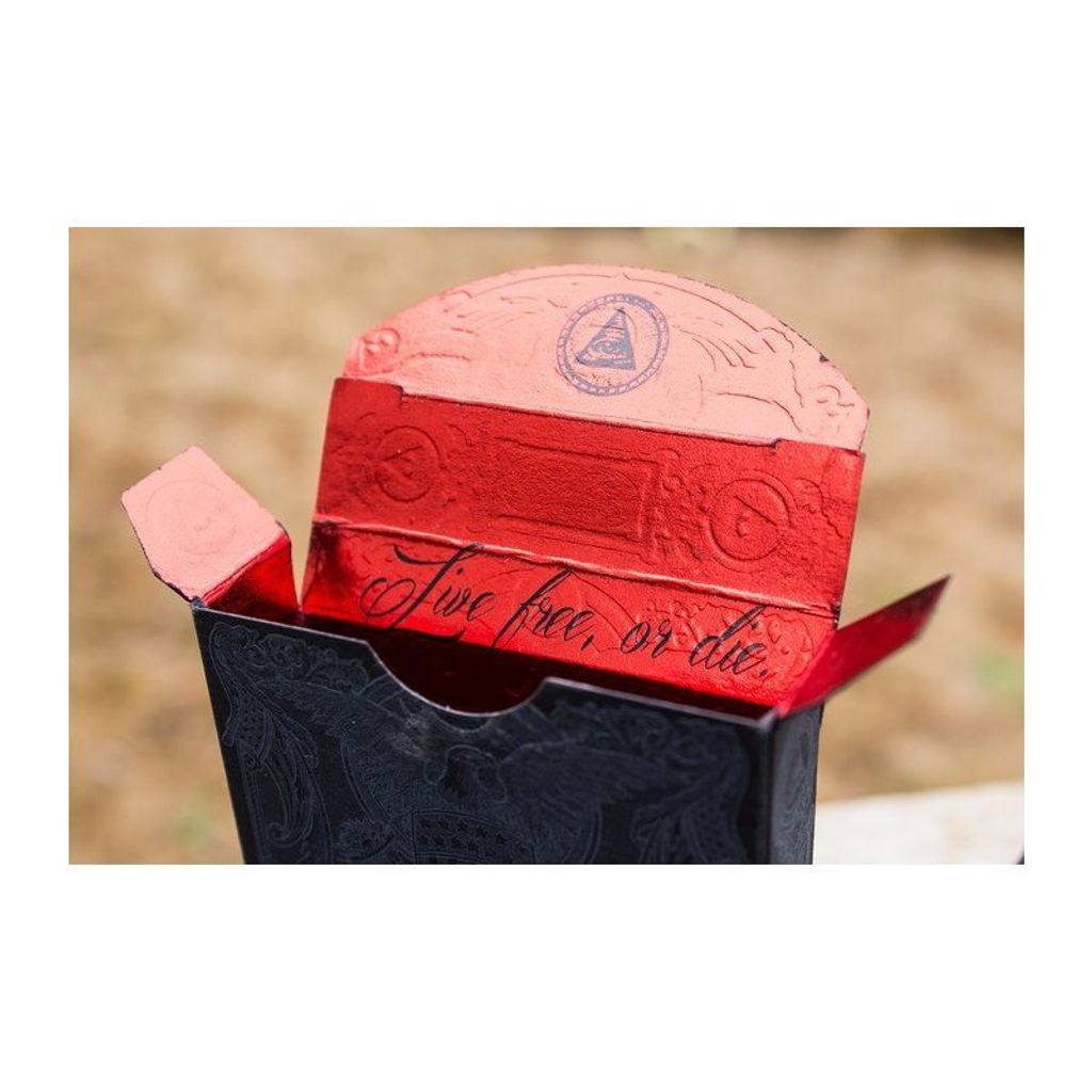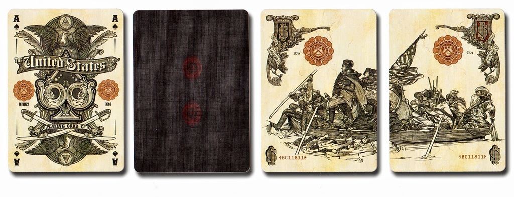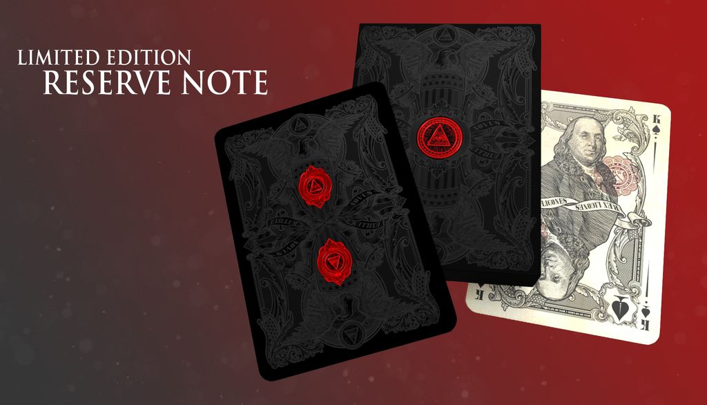 The Black Reserve Note, like the other decks, was available in a Bicycle Branded version as well as a non-branded version. The UN-branded version does have the destitution of a two panel Diptych of George Washington crossing the Delaware as well as the black card backs (The Branded version houses the same deck as the White Reserve Note). Print runs for the Black Reserve Note were drastically reduced from it's companion decks. Only 1550 Branded version were produced and the UN-branded had a print run of only 1000. Just as the other decks in this series the deck features a numbered Holographic Seal.