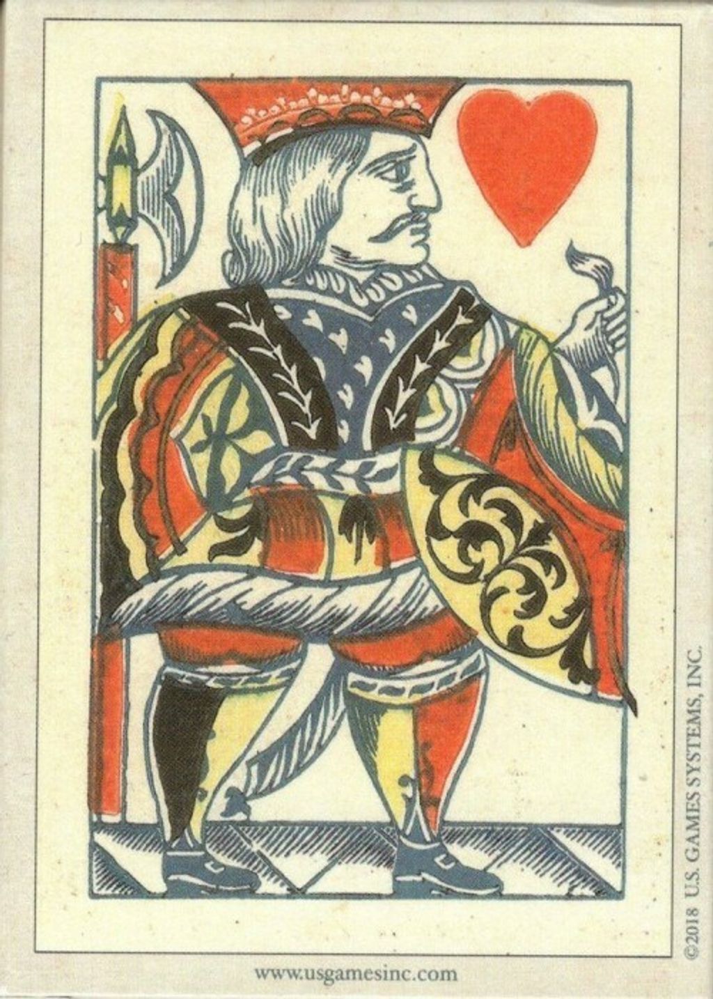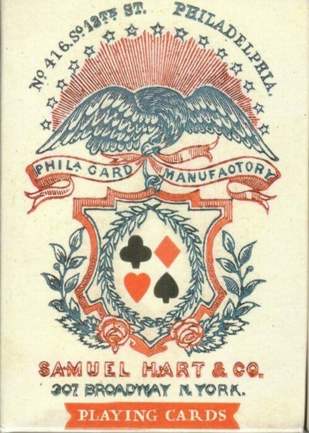 Authentic reproduction of an 1858 playing card deck by Samuel Hart & Co. with full-length, single-ended court figures, square corners and an unusual pictorial back design featuring a huntress peering across the landscape. Deck comprises 52 cards plus a conventional extra Ace of Spades and two information cards.