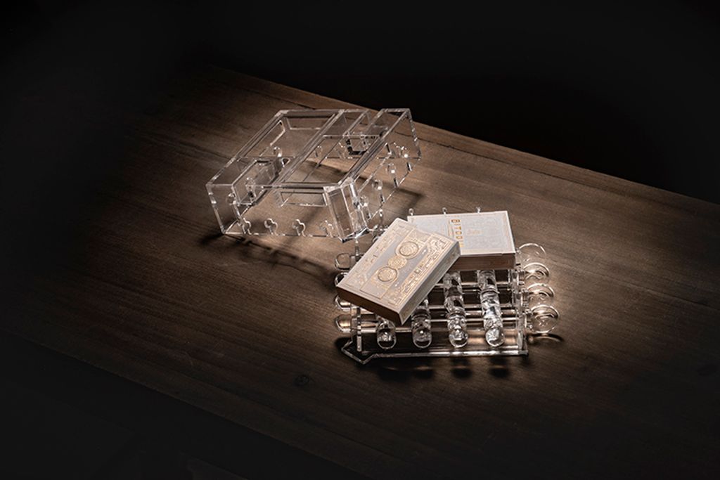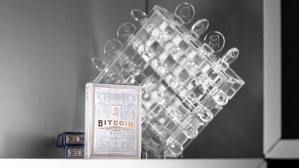 The Bitcoin Project is a high end acrylic puzzle box containing TWO white limited edition Bitcoin Playing Cards. We've designed this project to take you on a journey about the world of finance and technology while acting as an elegant tool for collectors, cardists, magicians, and tech nerds alike. The puzzle is a visual analogy of Bitcoin’s BLOCKCHAIN technology where one must do “proof of work” in order to solve and mine the Bitcoin Playing Cards out from the puzzle block.