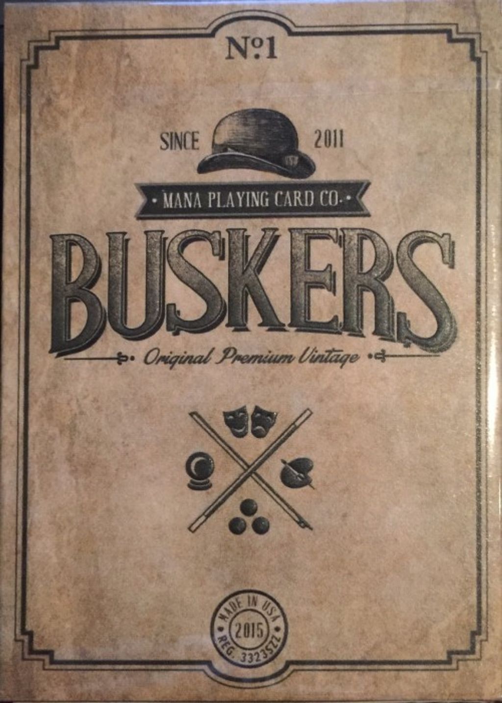 The Buskers Original Vintage deck is an unlimited release through United States Playing Card Company with their trademark Air Cushion Finish. It has a nostalgic design of old classic playing cards of the past. The court cards are hand illustrated featuring several different kinds of street artists and performers. The back design is intricate and simple at the same time. Look closely and discover the clever icon that brings the borderless back design together.