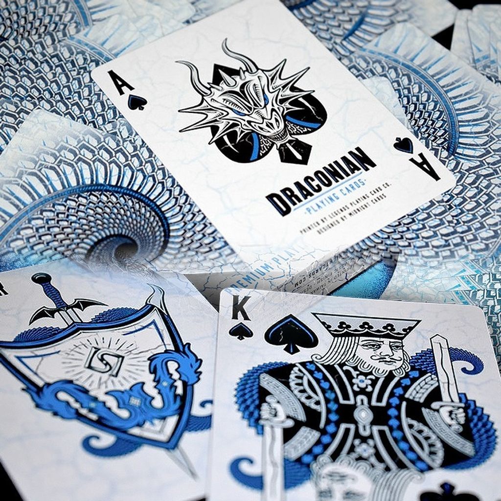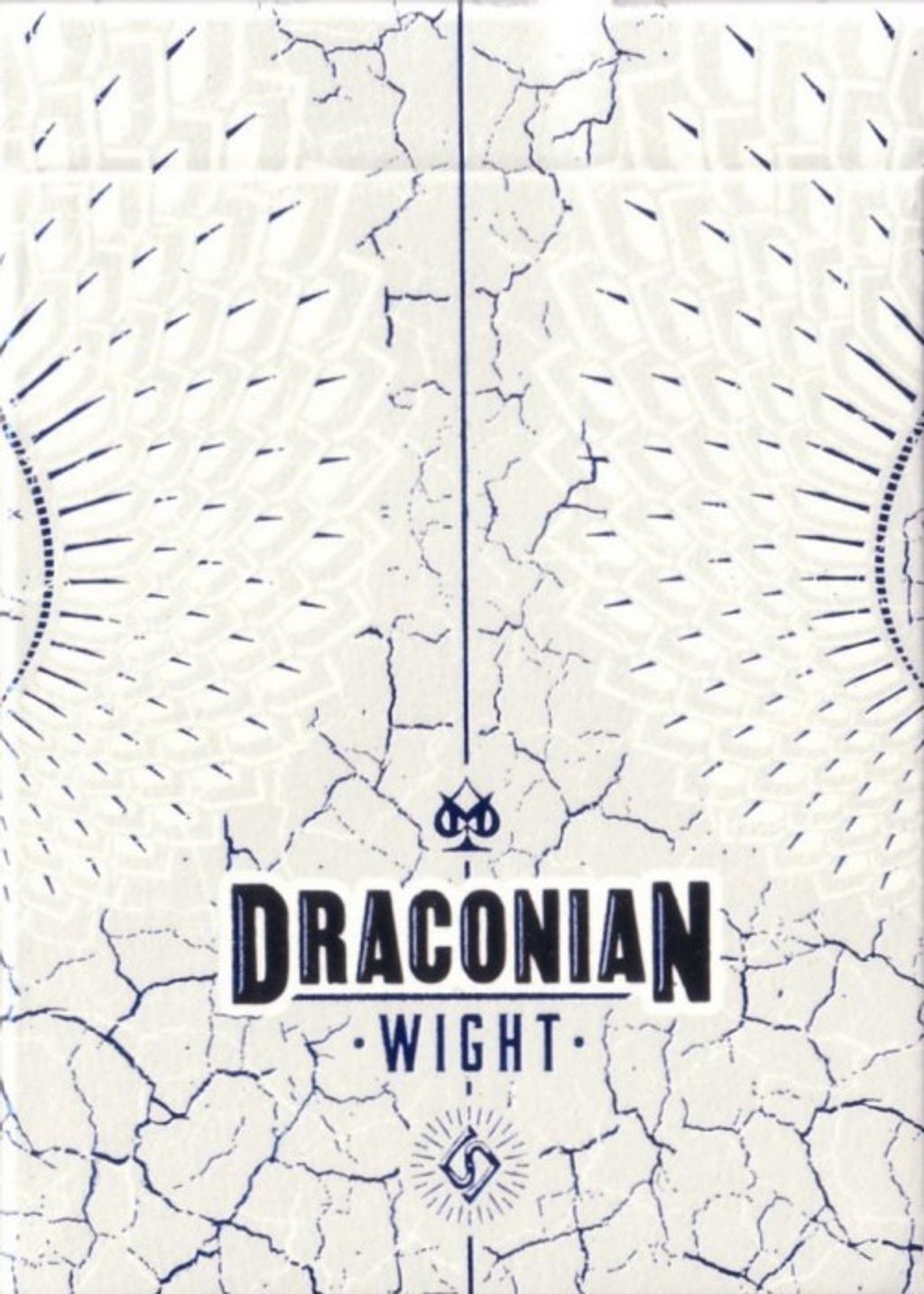 The back card for the Draconian WIGHT Playing Cards features a borderless optical illusion design formed from dragon scales - the card fan looks incredible! The face cards feature random fire/crackle fissures of blue over a subtle light grey background. The fissures are also incorporated into the designs of the PIPs, Courts, Ace heroes and Jokers. The classic Courts are flanked with the dragon scales' spiral-shaped designs. Everything comes together to create a cool look that is also very playable!