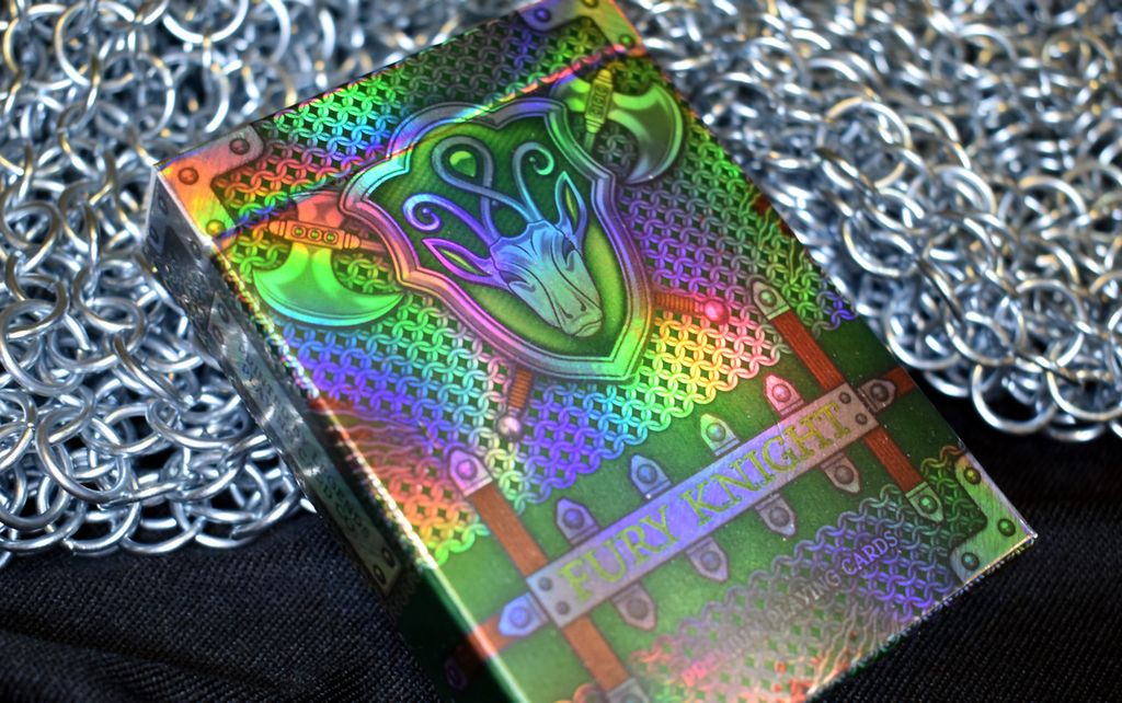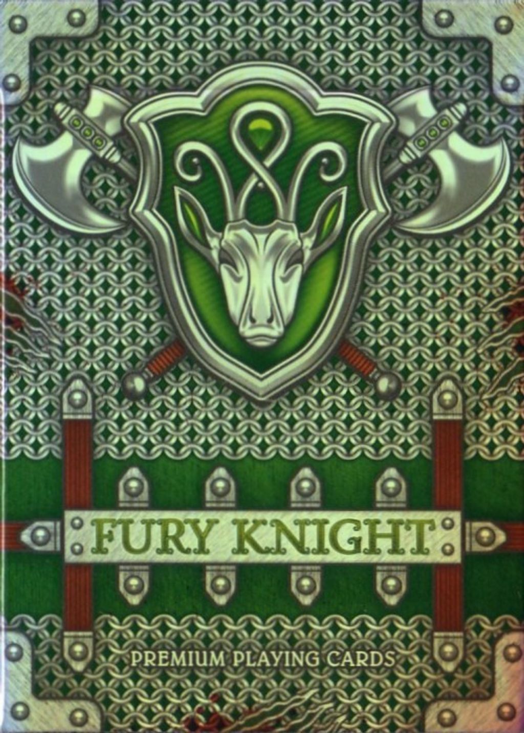 The design for the Fury Knight Playing Cards incorporates a chainmail background on the tuck box. It features a green accented shield and a stag head for his crest. It also includes the Knight's preferred style of weaponry - medieval axe.