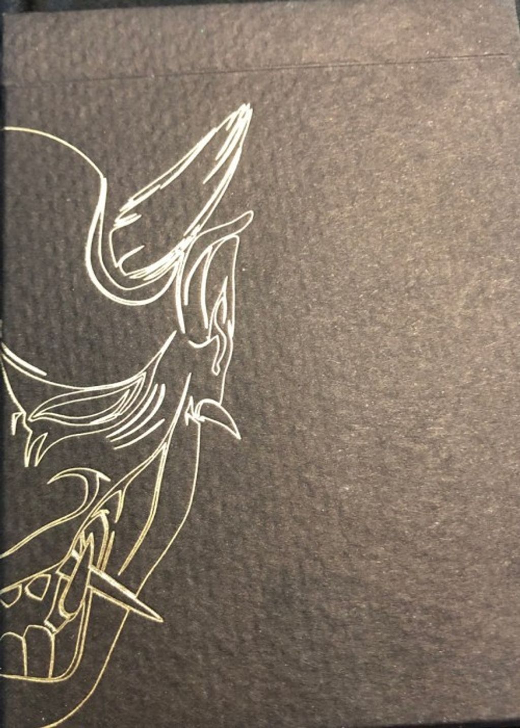When looking straight ahead, the mask appears frightening and angry; when tilted slightly down, the face of the demon appears to be sorrowful, as though crying. In much the same way, the gold foil mask on the Hannya Playing Cards tuck case emerges from the black mat darkness and peers into your soul.