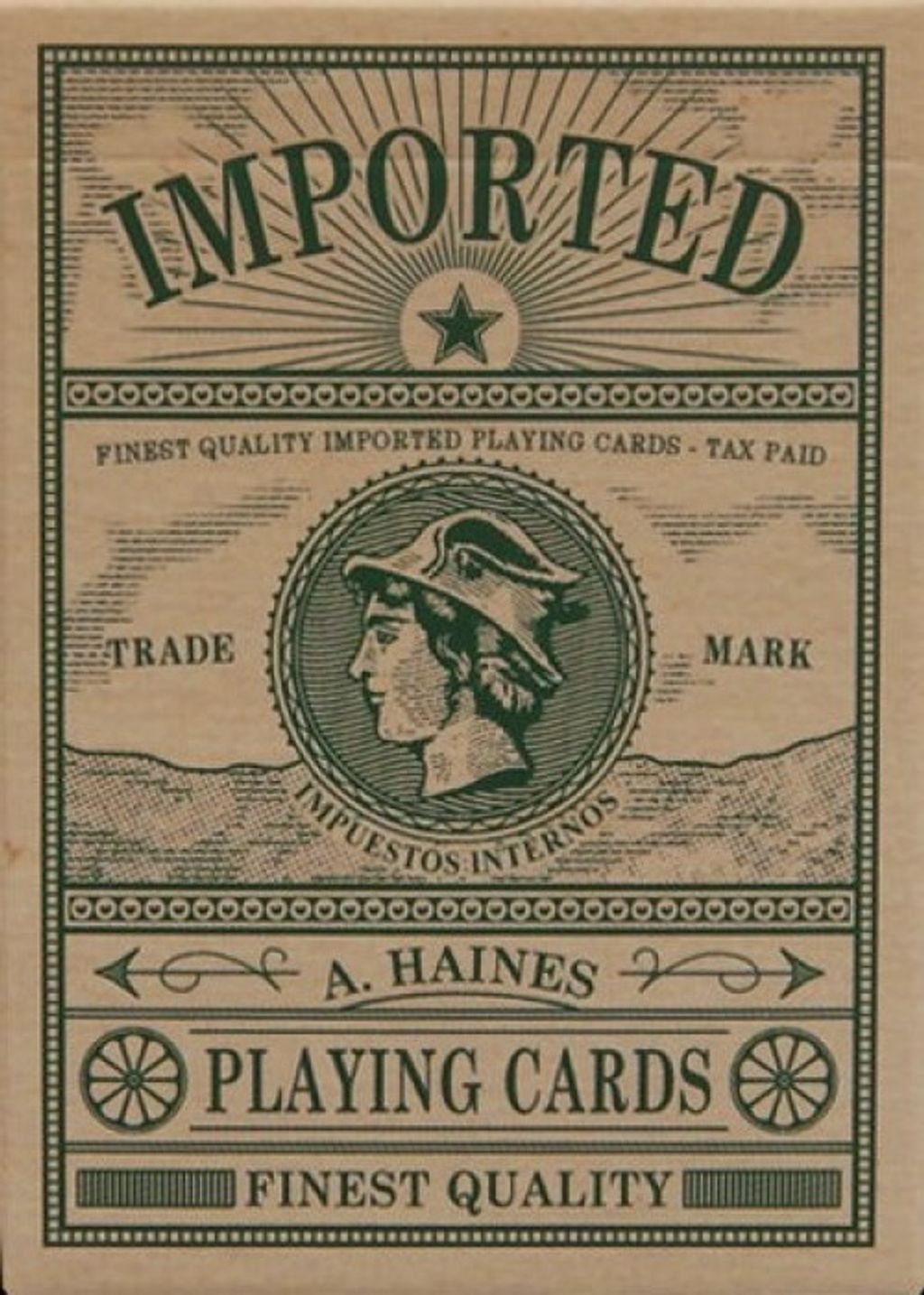 Inspired by classic decks from the golden age of playing cards: Imported Playing Cards is a fully custom deck of poker-size playing cards drawn by hand in a warm, vintage style and features standard re-drawn courts, pips and Aces in a velvety soft tuckbox drawn in the style of an antique tax wrapper.