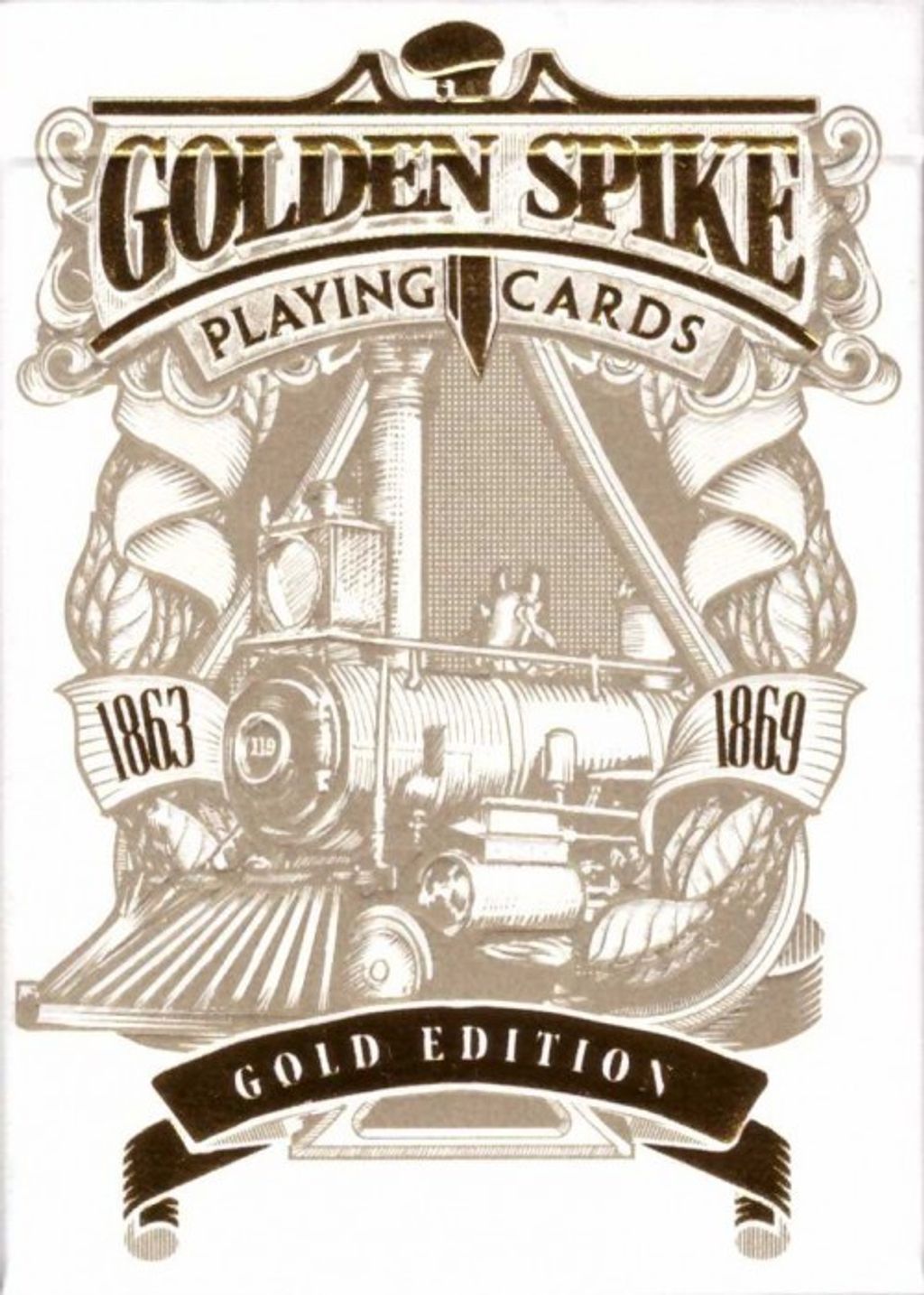 Limited "Gold Edition" Golden Spike Playing Cards are inspired by the completion of the 1st Transcontinental Railroad On May 10th, 1869. It was the first rail line that connected the east to the west and revolutionized transportation and commerce in a post Civil War United States. A Golden Spike was created as a commemorative piece to celebrate the completion of the 1st transcontinental railroad and was driven into the ground where the Union Pacific met the Central Pacific Railroad at Promontory Point, Utah. When the hammer rang out and the golden spike was driven into the ground, a new era of industry and expansion rang out across the United States.