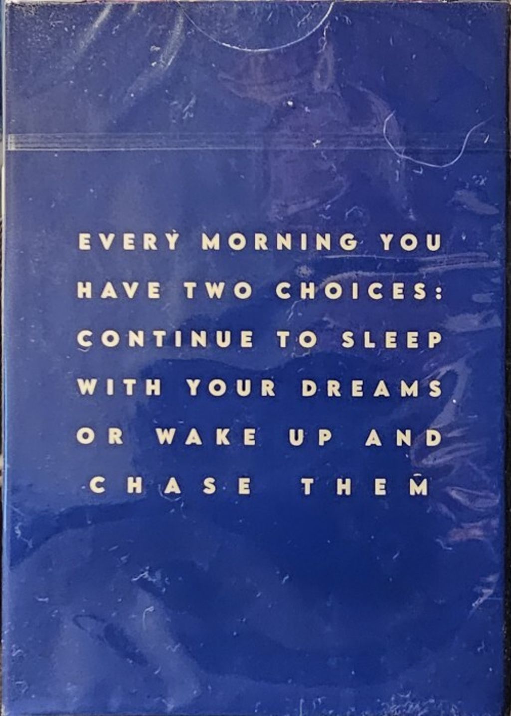 Two years after the very first Mindset deck, the Blue Edition is finally here. Designed for magicians, collectors and the every-day user. The theme of this deck is mindset and inspirational quotes, you will have a dose of motivation at your fingertips. Quotes are written on the court cards, the case and the Ace of Spades.
