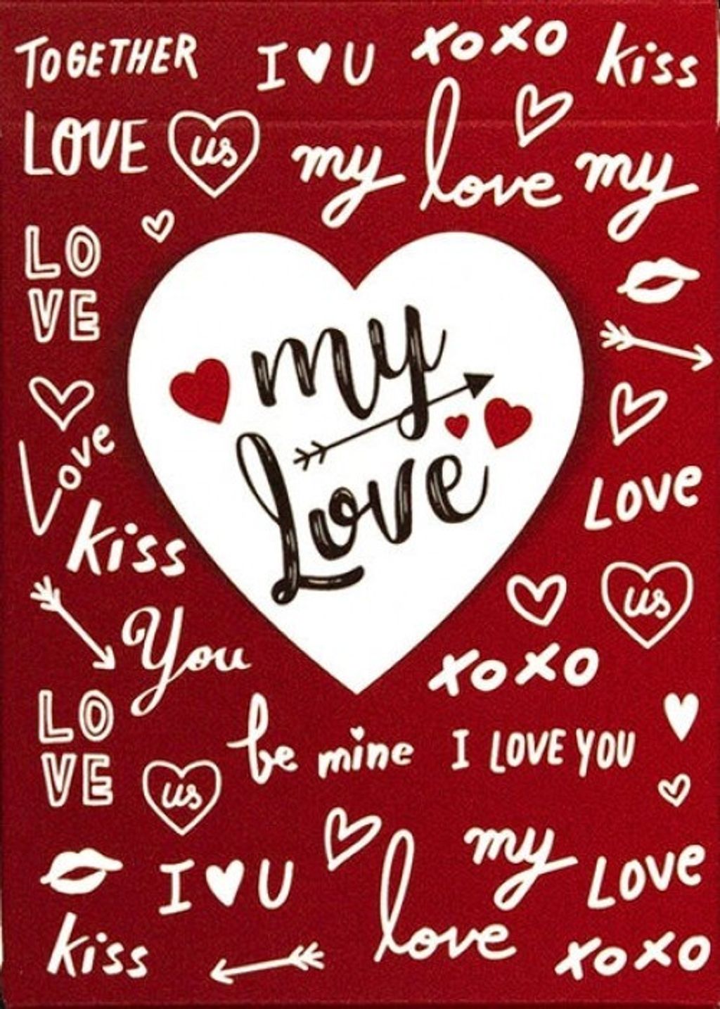 The card case is made of special paper with a comfortable touch. It's full of love in its design. It has red and white colors, with a big heart on the front. In the middle is the phrase, "My Love", and Cupid's arrow. You'll also be able to see lovers' prattle, Cupid's arrows, a love bite, and many hearts.