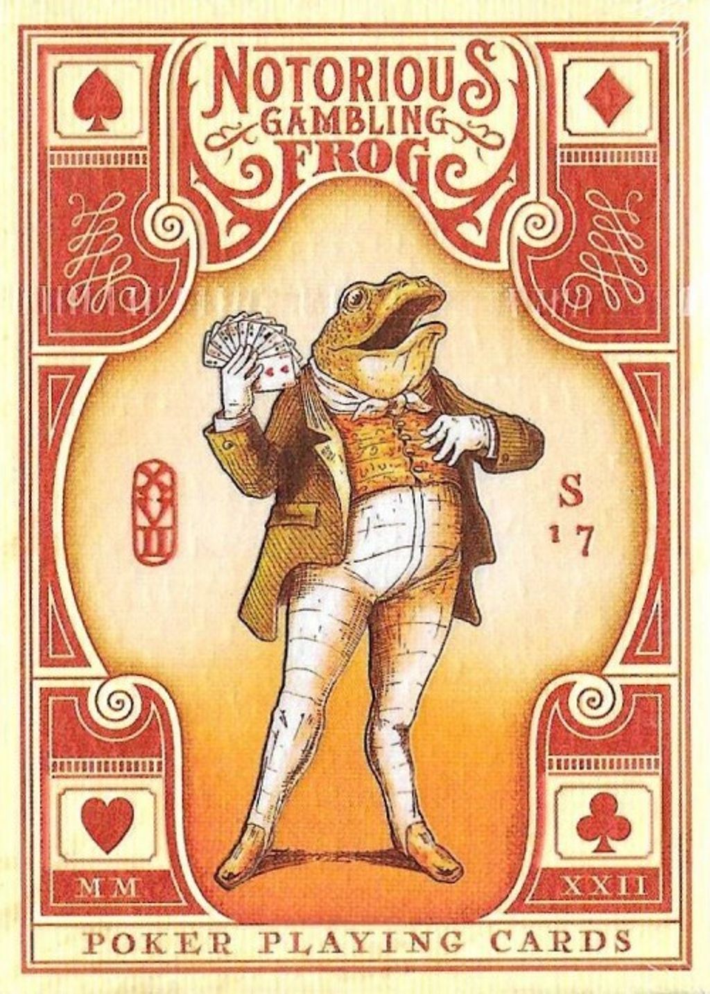 The Notorious gambling frog is a standard deck with redesigned standard court cards. It is designed to look classic with a touch of art nouveau style on the back design. The deck features high readability with its 4-corner-index, which is great for playing card games and for card tricks.