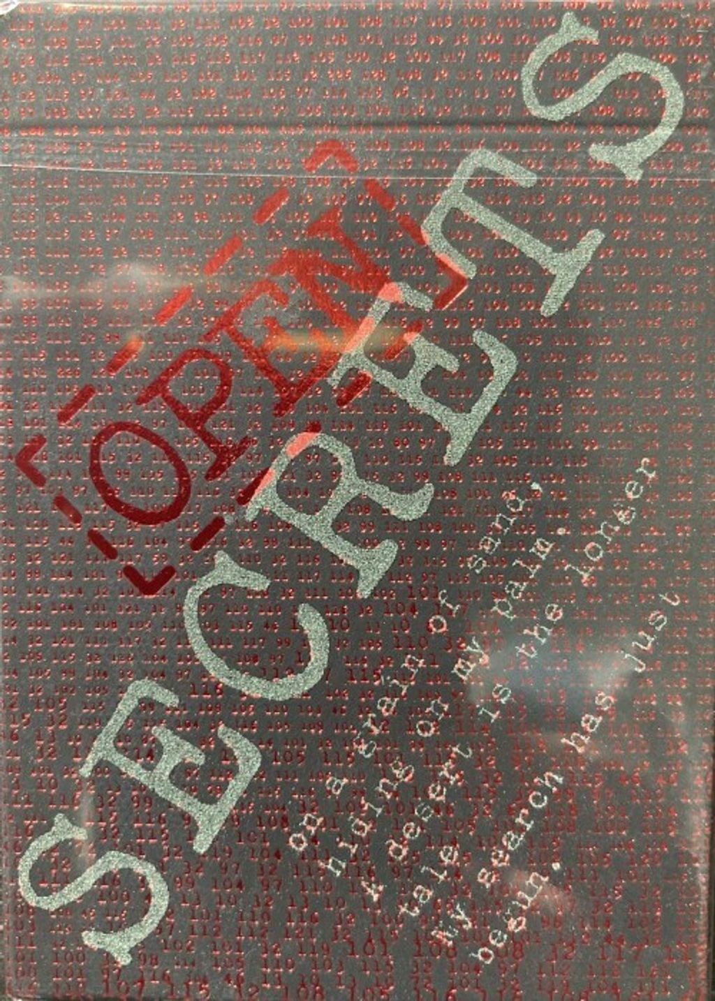 Open Secrets is a deck based around the theme of "hidden in plain sight, but difficult to see." Even the title has a double meaning. It is an invitation to open its secrets, or it states the obvious that the secrets are already out in the open.The tuck box is constructed out of a rich dark black card stock and is illumined with an alarmingly red foil. The red signifies danger, secret, passion, illusion, the hidden; only glowing when light chances upon it.