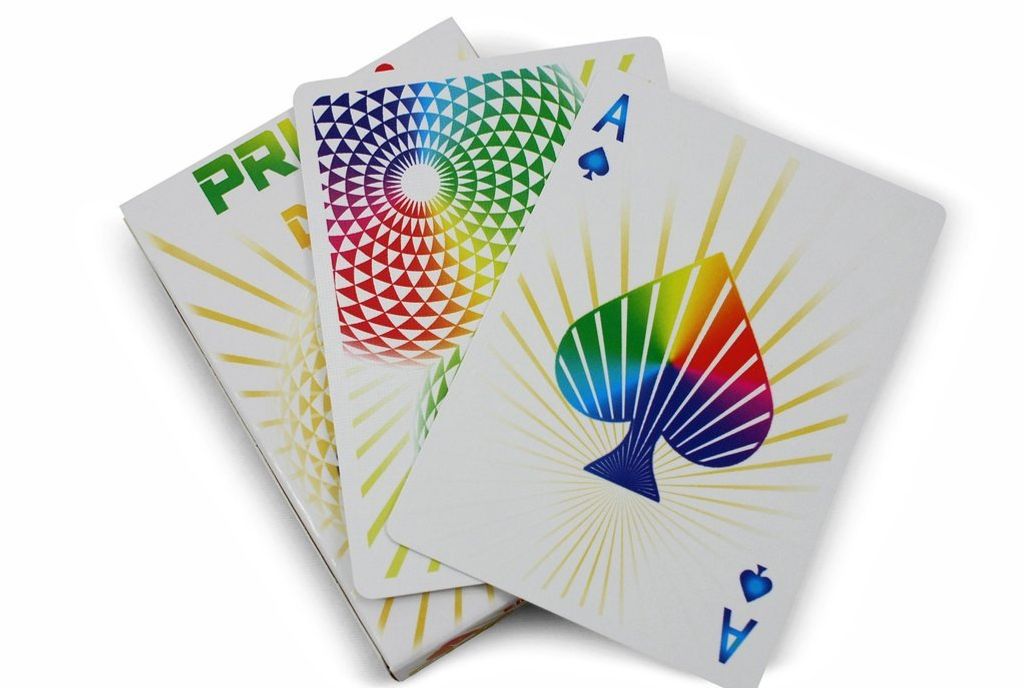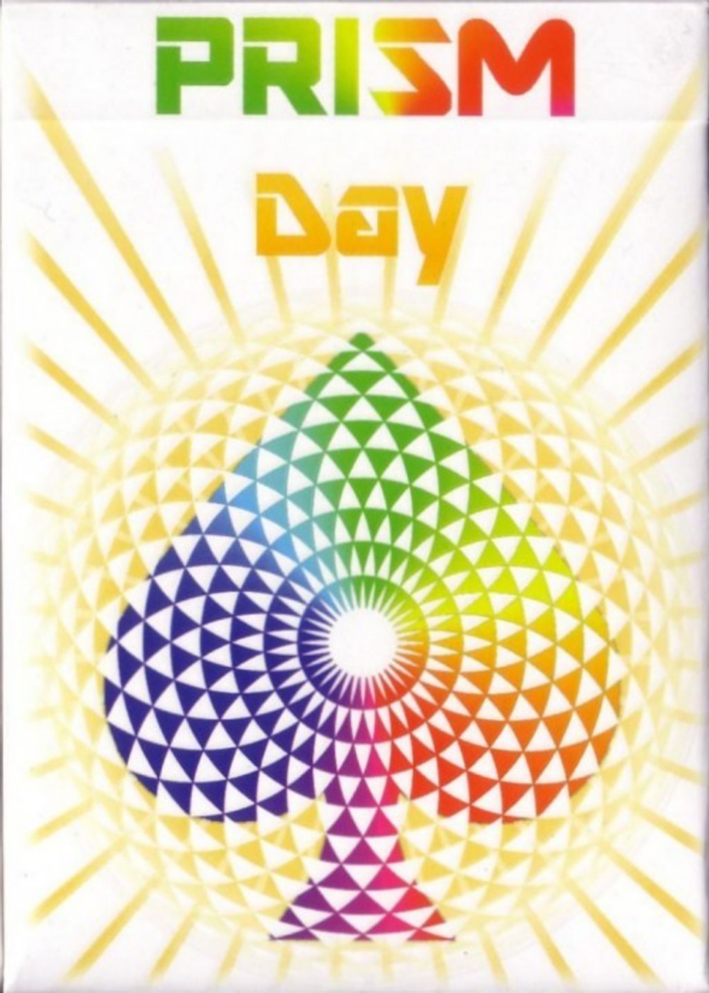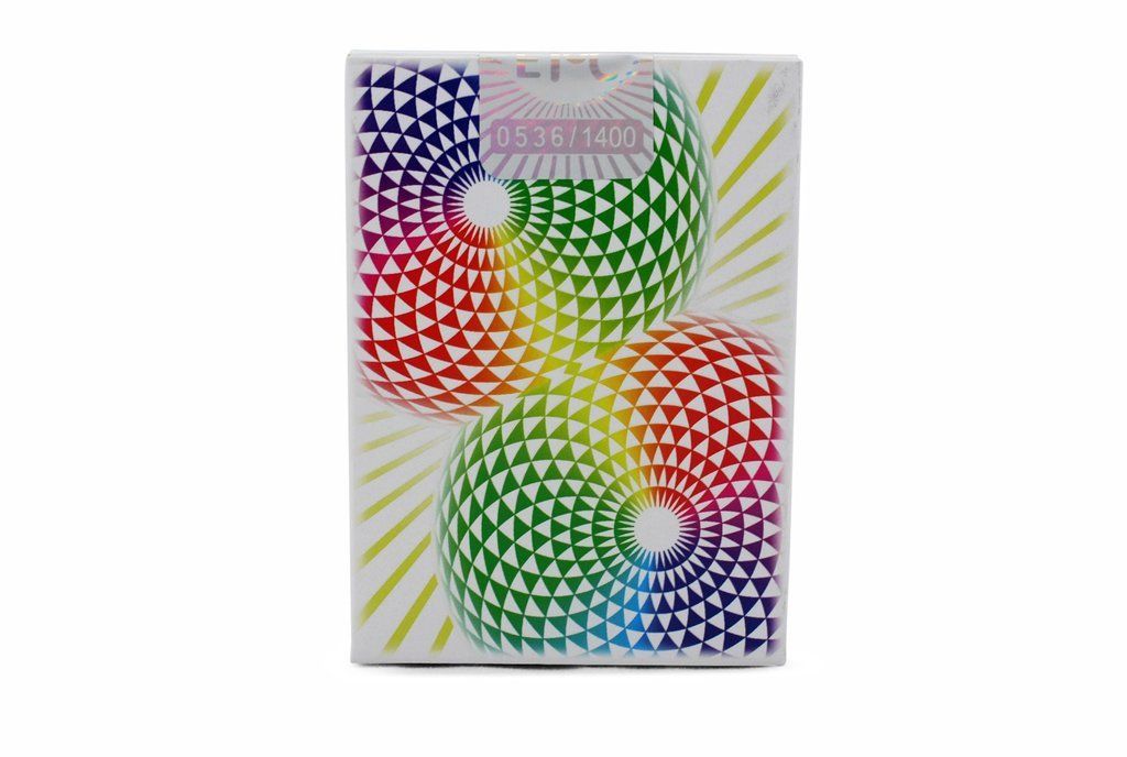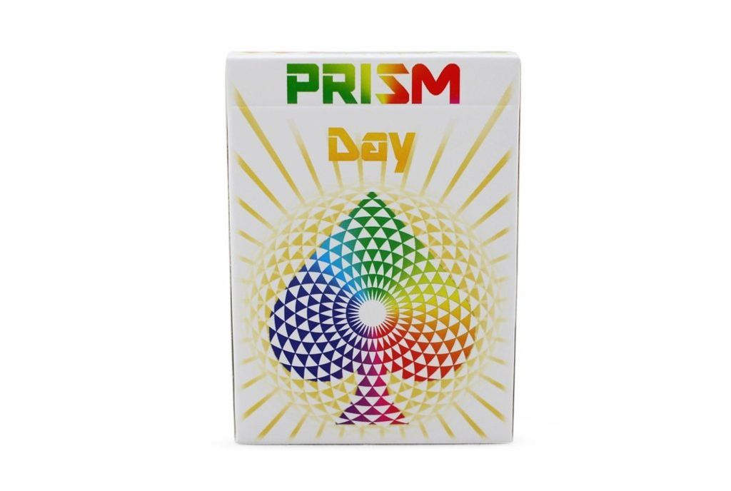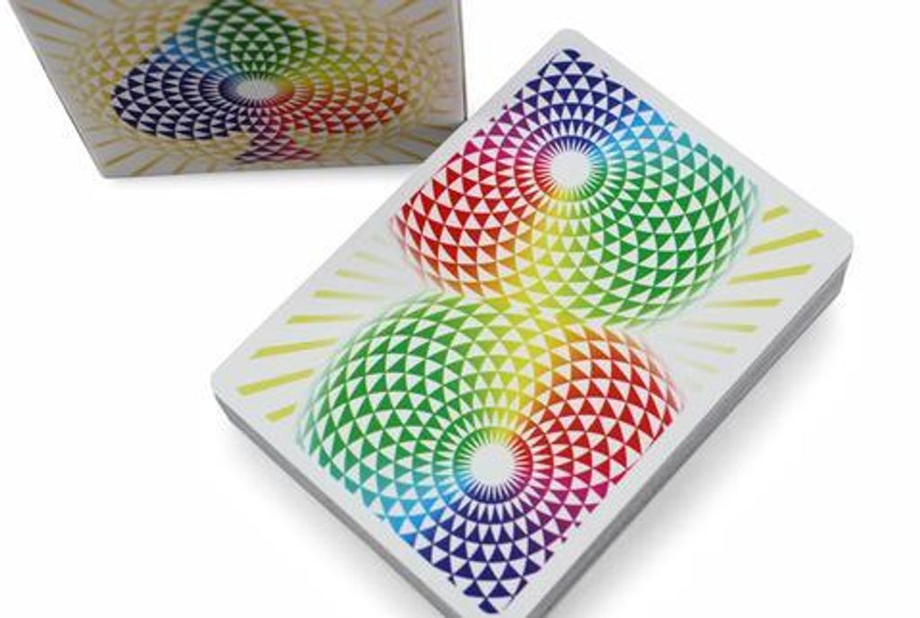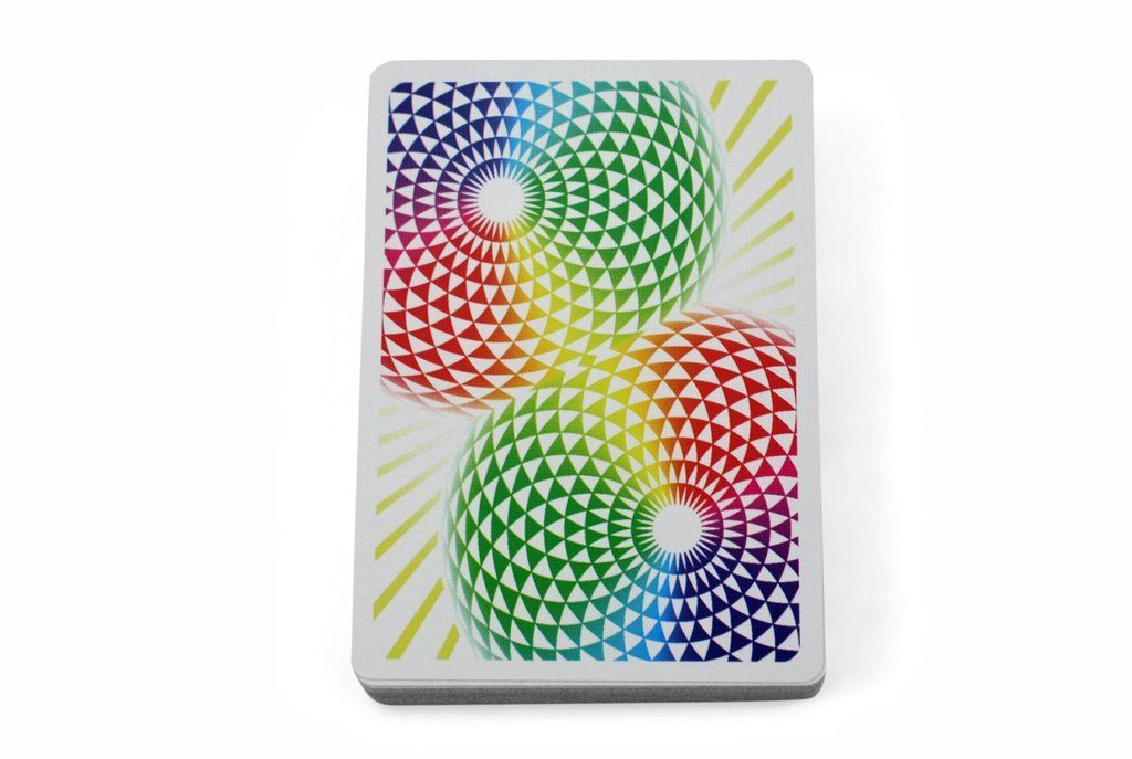 In Prism: Day, this beauty of this prismatic rainbow flows across every inch of the 100% custom deck – even the pips “refract” and ripple with light! The card backs feature a hypnotic prismatic spiral pattern, while the colorful custom court explodes into color. The custom jokers invite the viewer deep within the bands of the color spectrum.