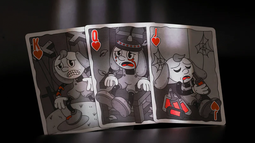 Each number card features atypical pin placements, which are adorned with 4 unique motifs representing the suits. Each motif reflecting the harsh and morbid themes of the darker films produced by studios.