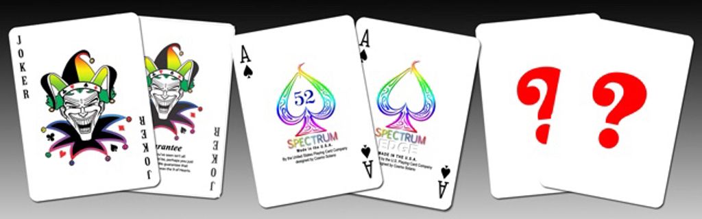 The deck has 51 standard faces and the following "custom" Spectrum designs: The Ace of Spades, the Standard Joker and the Guarantee Joker (with reveal). There are two special (gaff) cards included as well.