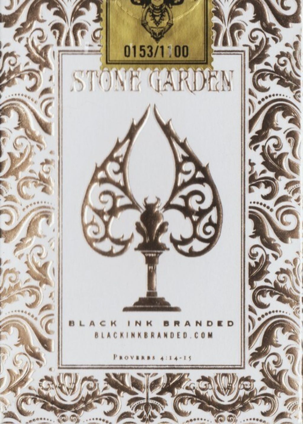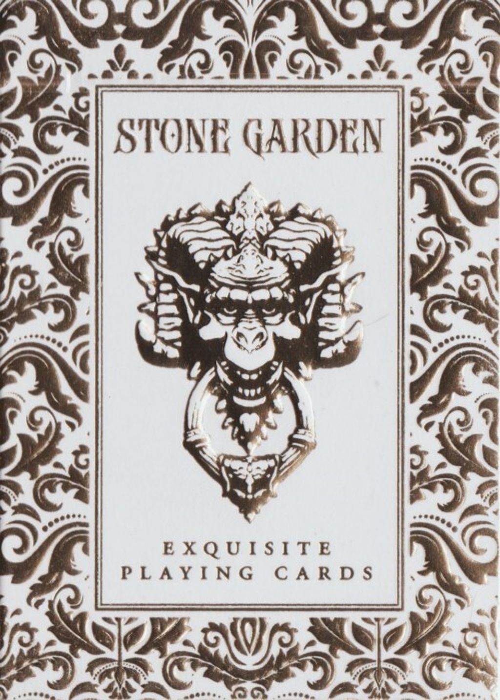"A shroud of mist rolls across the courtyard, yet the statues stare into the fog as if their gaze will penetrate it, while wings are taught, and fangs barred to warn those who would dare to invade this holy place. It is believed that no spirit foul or fiendish dare approach this sacred ground, for under strict protection lie all who pass beneath the grotesque and gruesome gargoyles who stand sentry. The lives of all within these walls are safe from demonic descent or even the downfall of a destructive deluge, for the astute gargoyles will defer either attack away from this hallowed sanctuary and bid them return from whence they came."Stone Garden is a uniquely designed custom deck of playing cards that exalts the gothic gargoyle; statues and architectural adornments whose purpose lay in the protection of the individuals within Medieval Churches. Created by Jody Eklund, Stone Garden captures, the style of this by-gone age, with the striking reflectivity of double-sided full-foil printing.