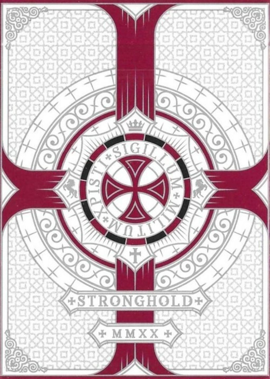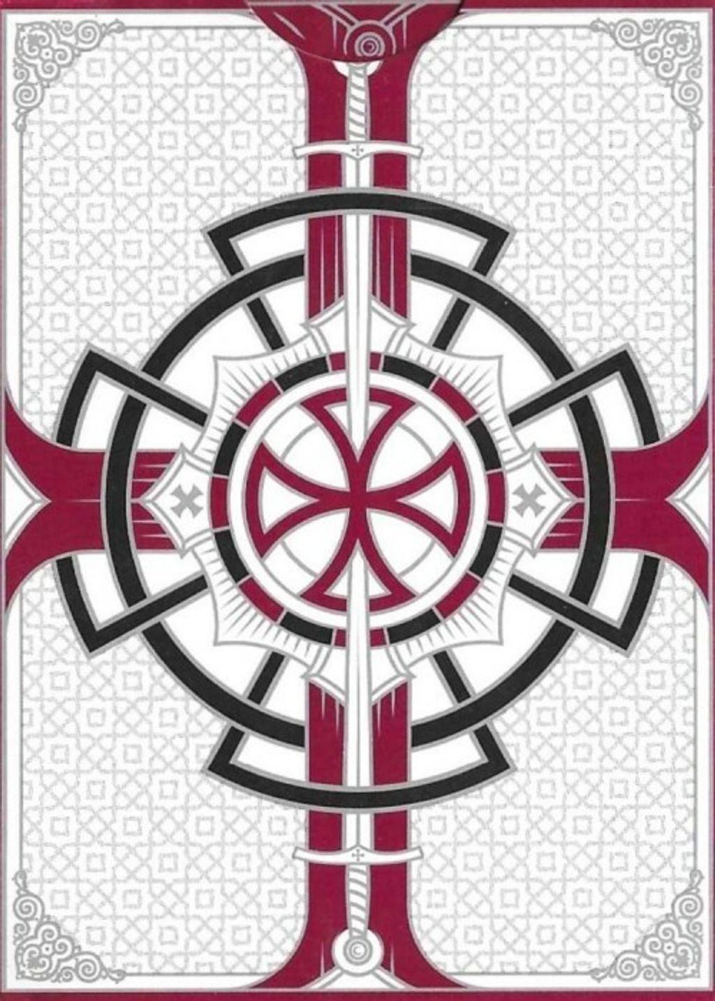 The purity of the knight spirit is reflected in a white background back where the cross and the sword, symbols from the Templar imagery, are depicted in silver and red in an elaborate symmetrical composition. That symbology is also present in both Jokers.
