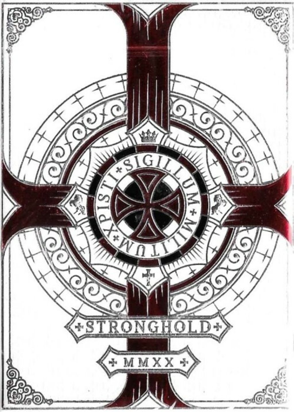 The purity of the knight spirit is reflected in a white background back where the cross and the sword, symbols from the Templar imagery, are depicted in silver and red in an elaborate symmetrical composition. That symbology is also present in both Jokers.