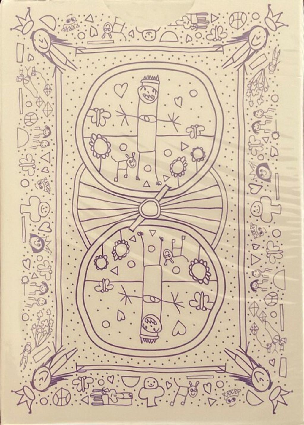 The deck maintains its hand-drawn aesthetic while remaining functional. The back design takes inspiration from Bicycle Rider Back Cards. Giving the iconic design a playful twist, it makes for a familiar yet original look that is sure to stand out. Every single element was taken directly from the drawings. Be sure to check out all the fun details! The tuck box is a collage of illustrations from different drawings. A colorful front design is accompanied by sides colored in yellow, green, blue, purple, and pink.