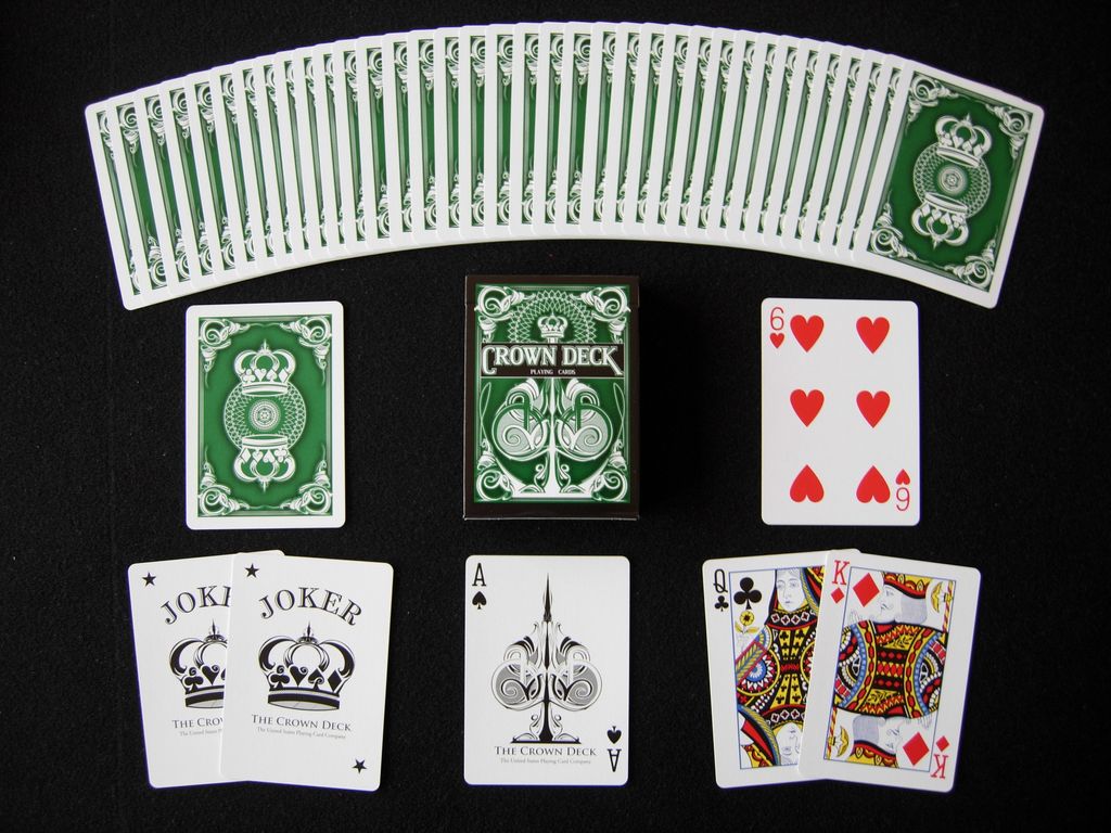 The Green Crown Deck is a new deck of custom playing cards designed to evoke quality, elegance, and style. Featuring Arrco faces, with a Tally-Ho inspired design, the Crown Deck was made for us by the US Playing Card company with a BRAND NEW stock and finish process to ensure lasting quality, durability, and handling superiority. The result is a deck that feels as good as it looks, and will add a touch of class to your magic and flourishes. The collectible first edition is in very limited numbers, so pick yours up today!