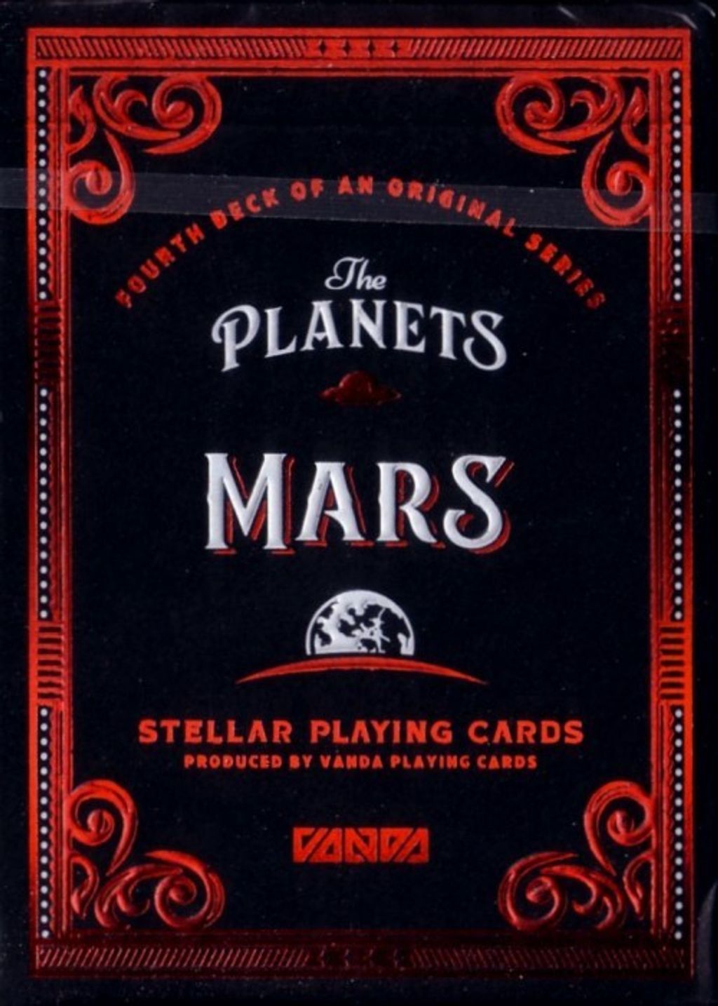 The Planets is a collection of decks representing the planets in our solar system, starting closest to the sun and moving outwards into the surrounding universe. The fourth deck of this series is Mars, featuring an all-male court. This is the most luxurious Vanda deck series to date, with tuckbox features that include red holographic foil, white foil, interior foiling, and embossing.