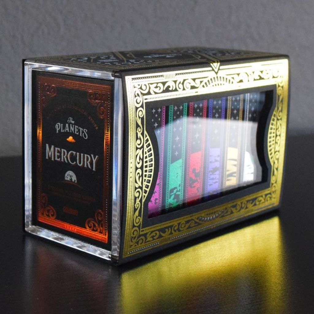 The Planets is a collection of decks representing the planets in our solar system, starting closest to the sun and moving outwards into the surrounding universe. This set features 8 fully custom-designed decks. Each individual tuckbox is embossed and printed with holographic metallic foils both inside and outside. The set comes packaged in an 8-deck acrylic Carat Case with a magnetic lid. The box has an outer sleeve printed with digital foils. Designed by Srdjan Vidakovic, this is the second project created for the Vanda Artists Series.