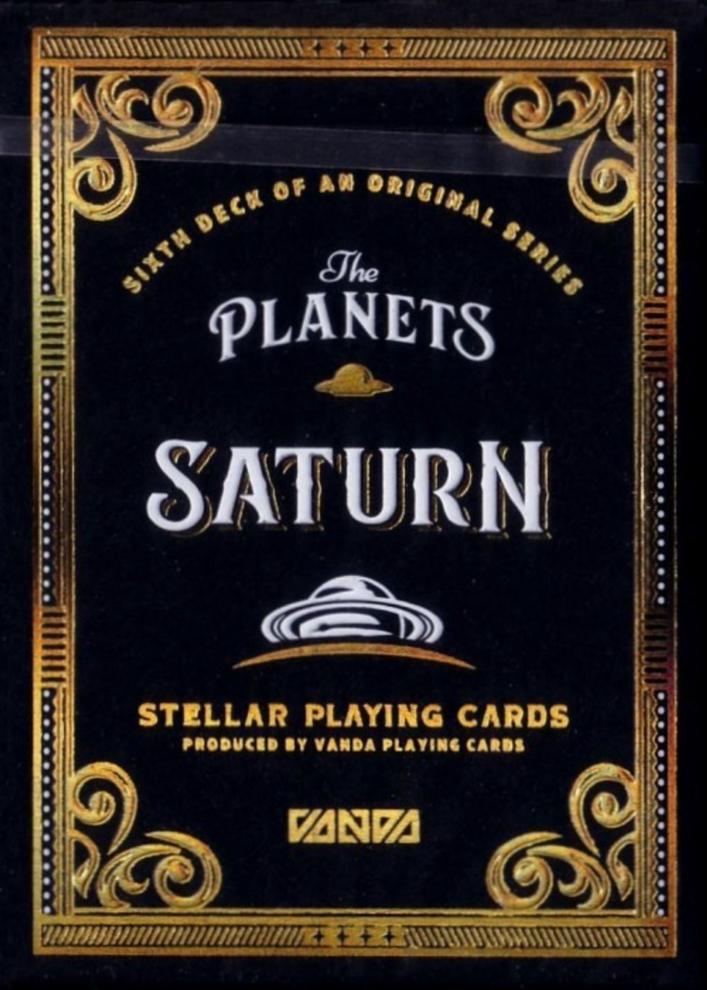 The Planets is a collection of decks representing the planets in our solar system, starting closest to the sun and moving outwards into the surrounding universe. The sixth deck of this series is Saturn. This is the most luxurious Vanda deck series to date, with tuckbox features that include gold holographic foil, white foil, interior foiling, and embossing.