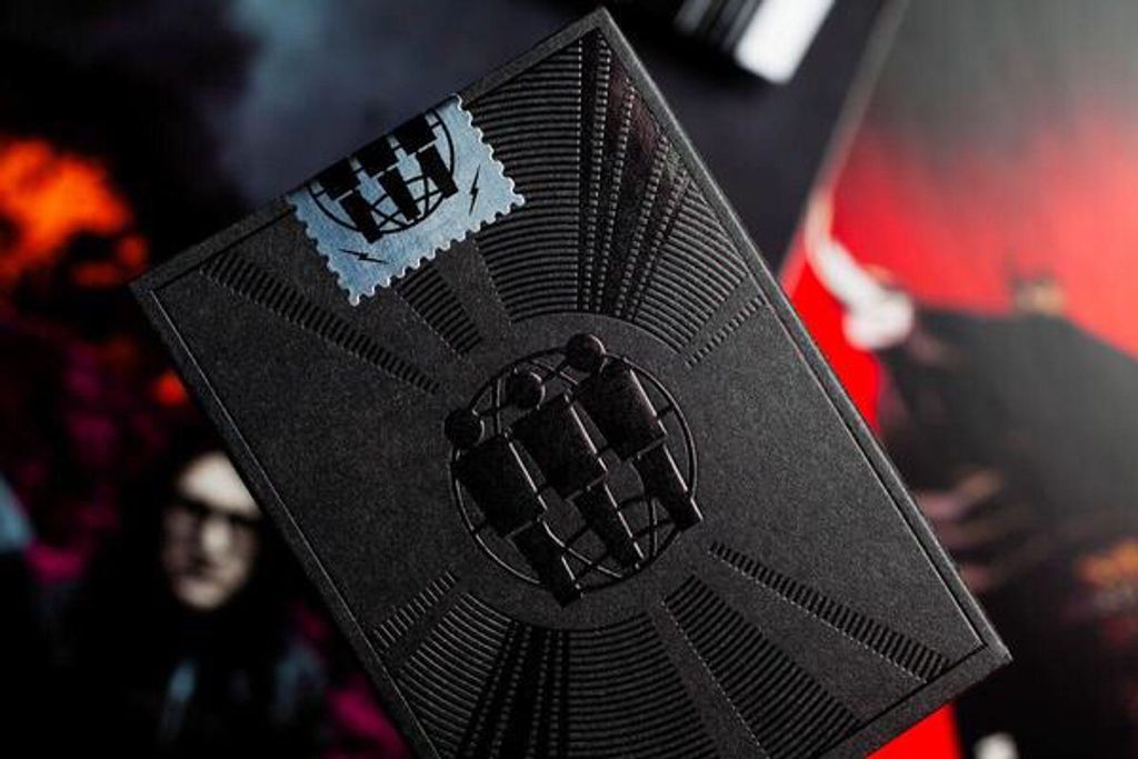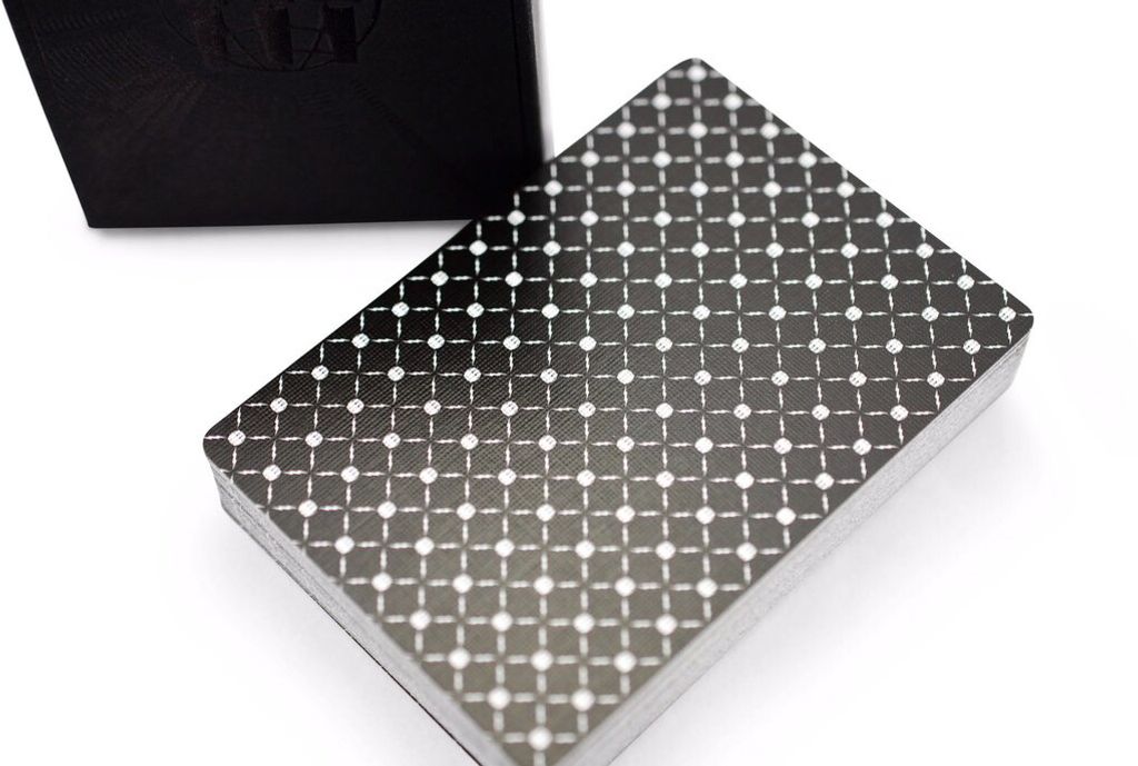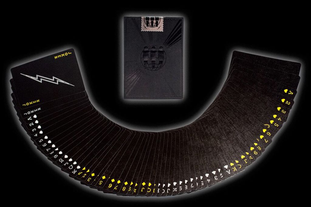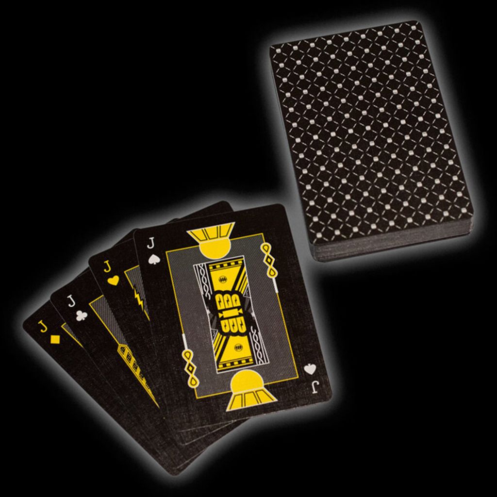 The black-on-black tuck case is embossed with foil accents. The playing cards feature a simple, borderless, diamond-type back design. The front design features an all-black background with white, yellow, and grey accents.