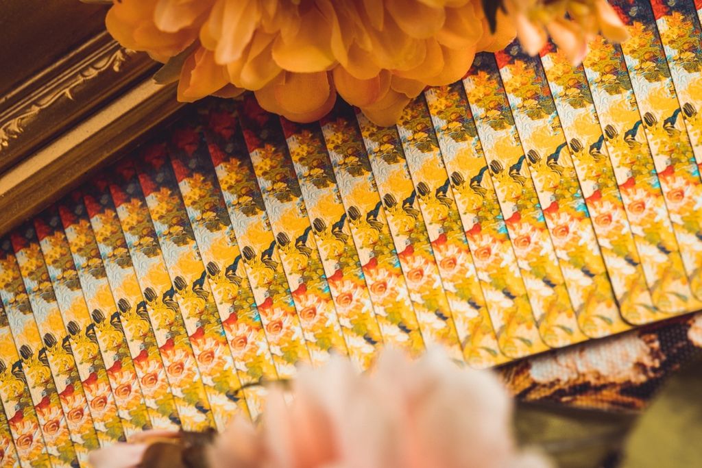 The card backs maintain a consistent design with the back of the card box, seamlessly integrating the theme of the famous painting into the habits of card players. With extremely narrow white borders and symmetrical, oil-paint-like textures, the cards exude sophistication. The diverse and vibrant colors - reds, yellows, blues, and greens - converge with flowers of various sizes and arrangements, creating a rich and full image. At the center shines a bright yellow chrysanthemum, serving as a focal point for the card's positioning function.
