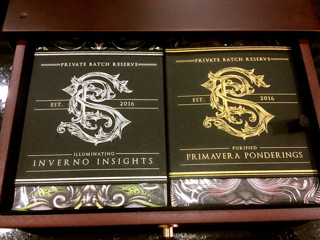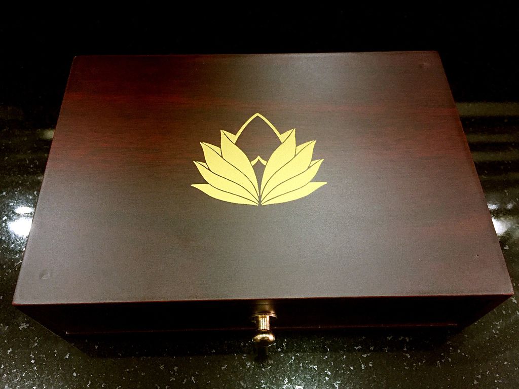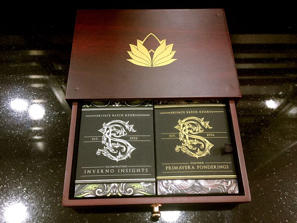 There's no better way to frame the color and scrollwork of the packs than to frame them in this beautiful rose wood finish cabinet. Features a pull out drawer, interior black felt inlay, and gold foil stamping interior, to complete the Apothecary experience.