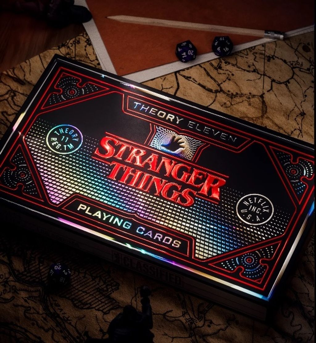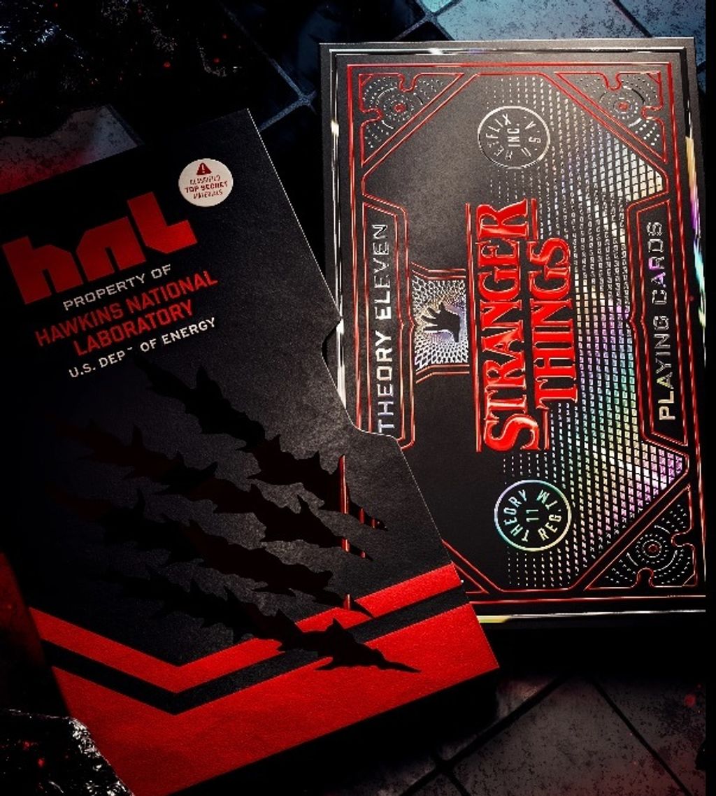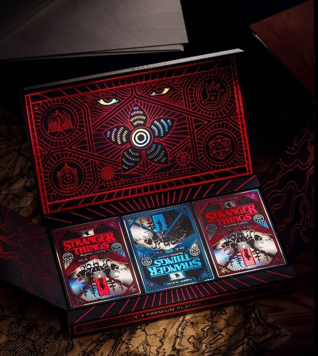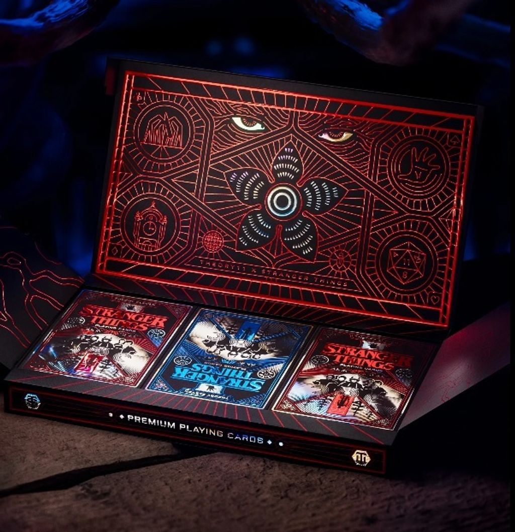 Uncovered directly from the Hawkins National Laboratory archives - three decks housed in a premium VHS-style box, featuring detailed embossing with striking red and holographic silver foil, featuring the blue holographic foil Upside Down Special Edition!