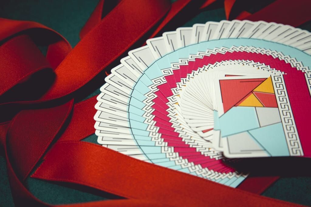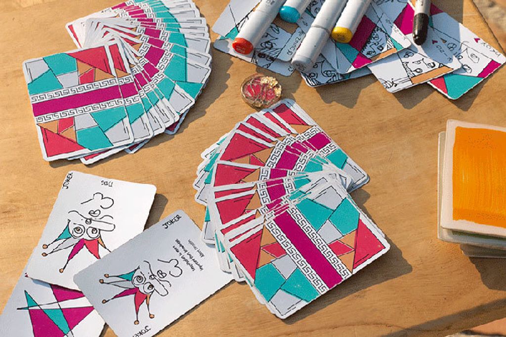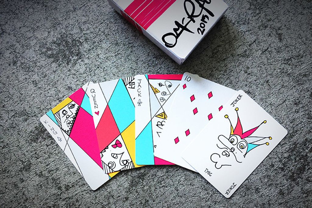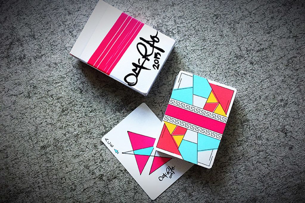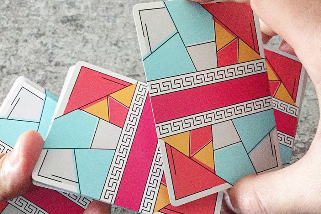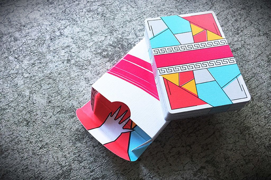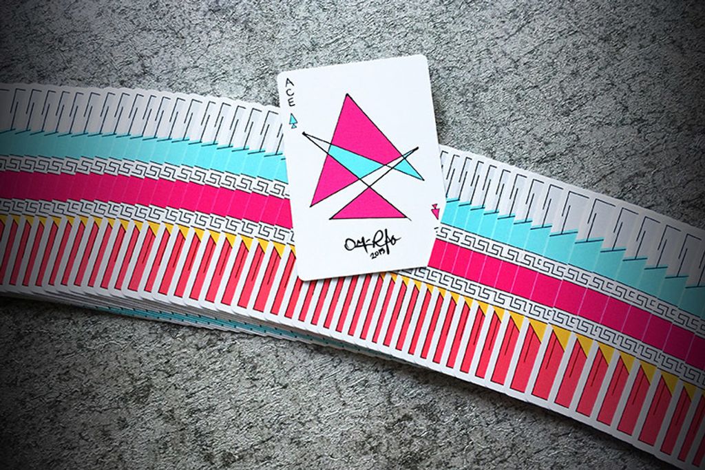 "The deck is fully customized from the geometric back design to the custom arrangement of the spot cards, right down to the custom court cards and Jokers. Even the tuck interior is customized!"