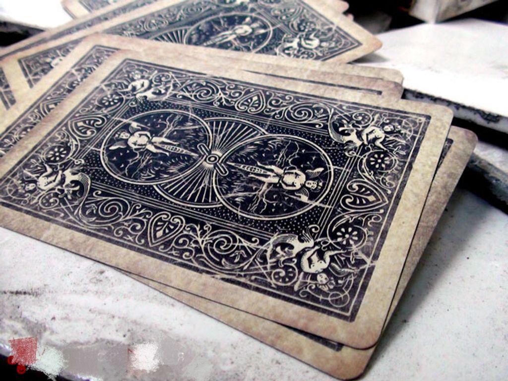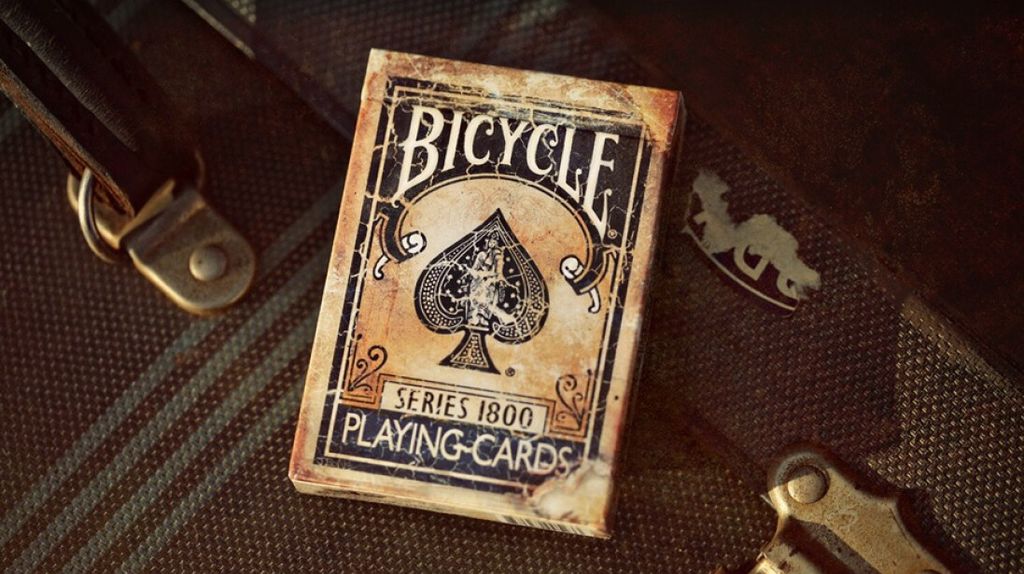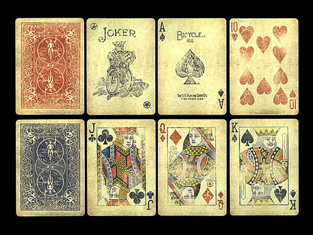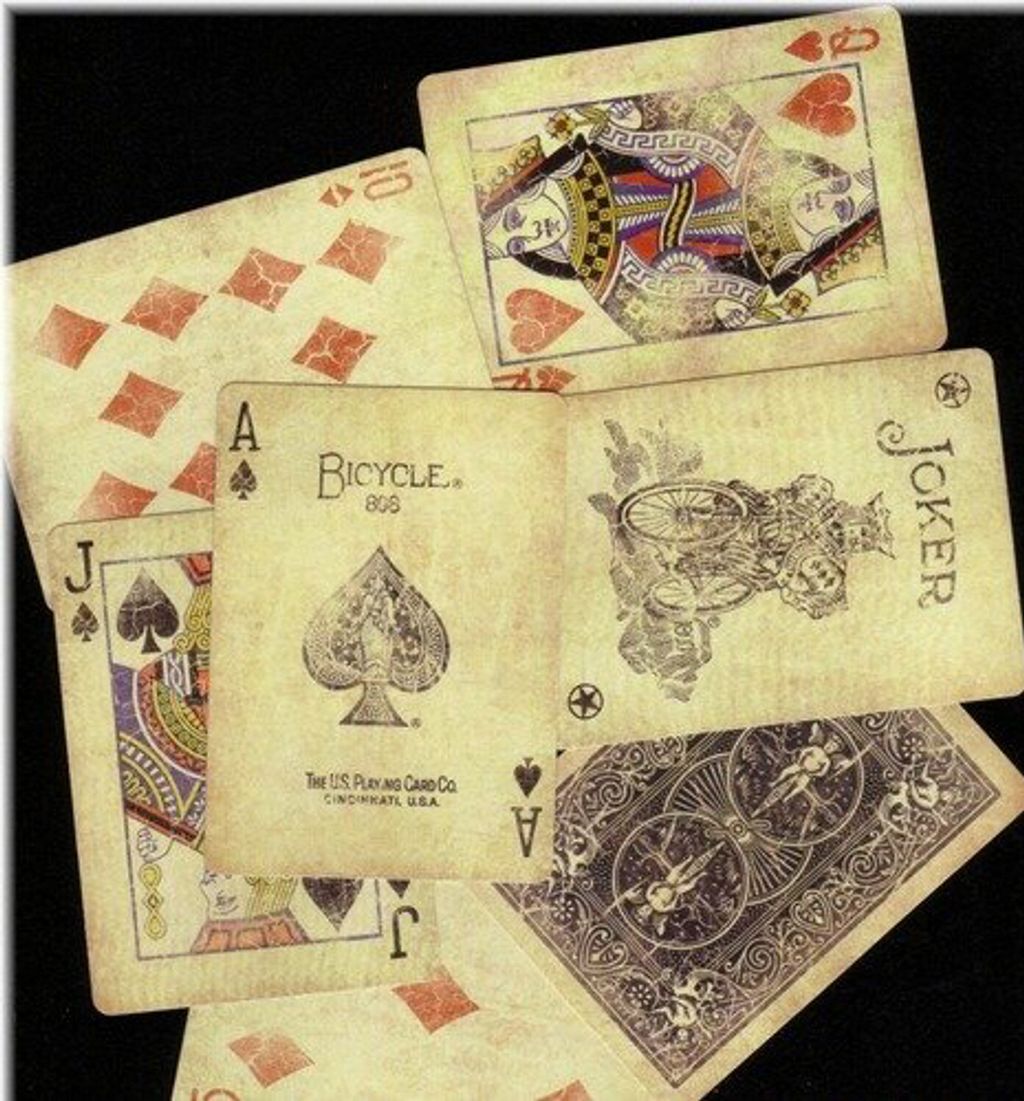 Looking like regular Bicycle Rider Backs that have been withered by time, the "artwork on each card was delicately hand-crafted by Ellusionist's top graphic team". Apart from the old look and details, they have standard Bicycle faces, including the 2 Jokers and the Ace of Spades. The box features a bar-code reveal.