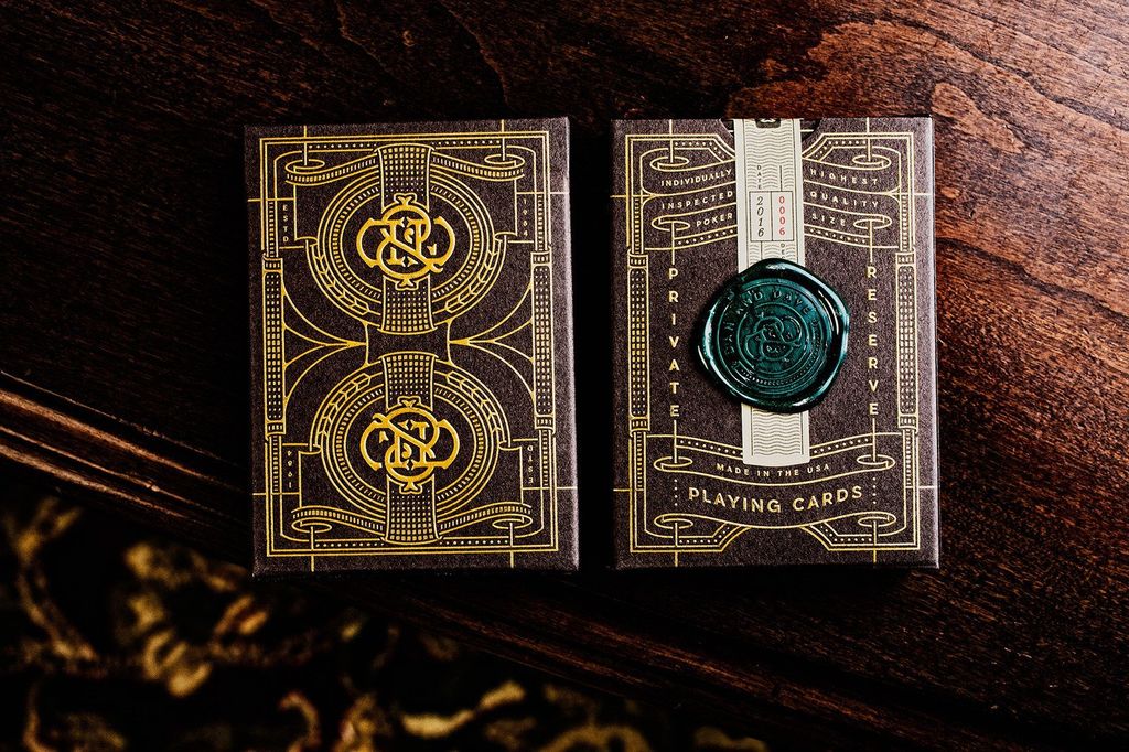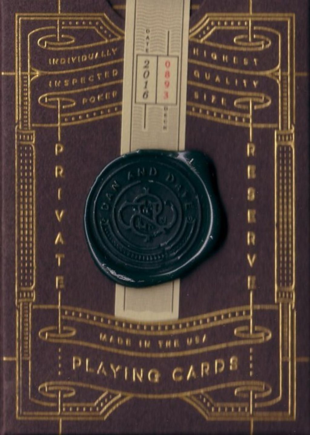 Individually inspected, signed and numbered. These special Dan and Dave Private Reserve playing cards were carefully printed by the United States Playing Card Company on a premium stock and finish to the highest standards. Inlayed with gold foil directly on the backs of each card for a luxurious touch. Housed inside an elegant box wrapped with a numbered stamp and sealed with wax for authenticity.