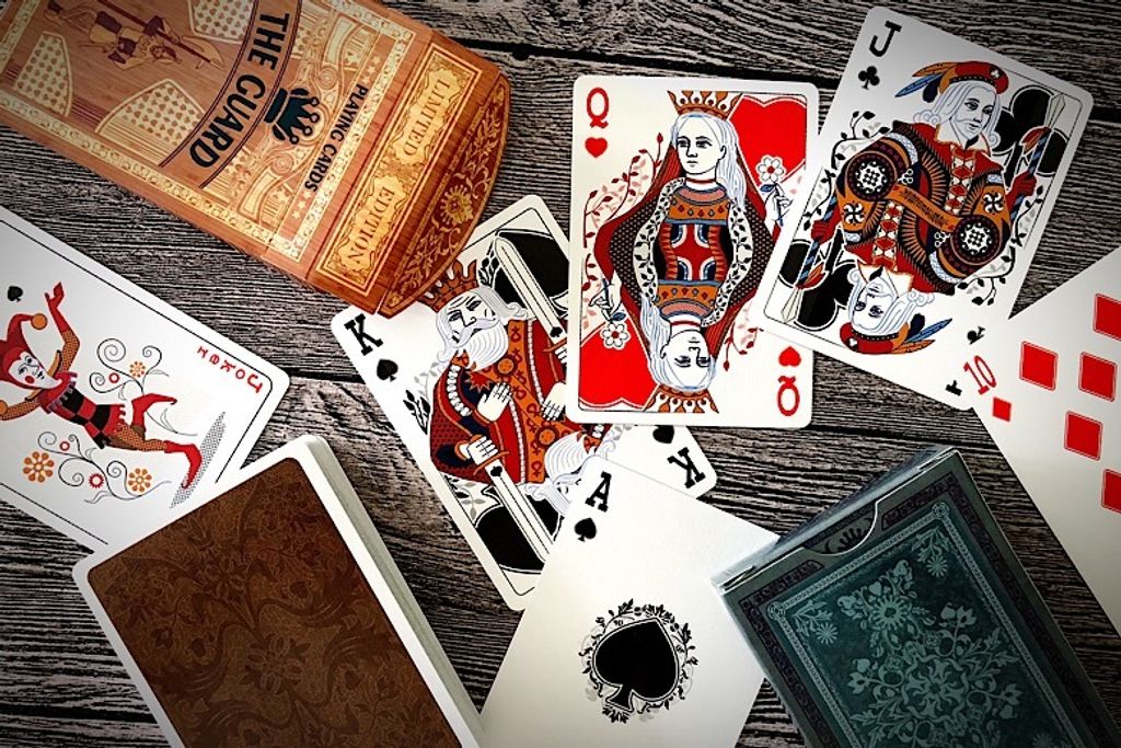 A retro-classic vintage inspired design for the modern player, collector, cardist or magician. The Guard Oak Playing Cards is expertly designed by well-known Polish artist, Artur Rajch. Interesting touches have been provided for the court cards and Aces. And, of course, someone is standing guard on the tuck case.