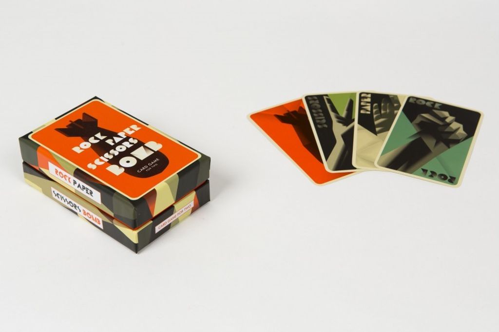 A unique, Futurist-inspired version of the quick-draw Rock, Paper, Scissors game with 5 custom illustrations by Mads Berg.