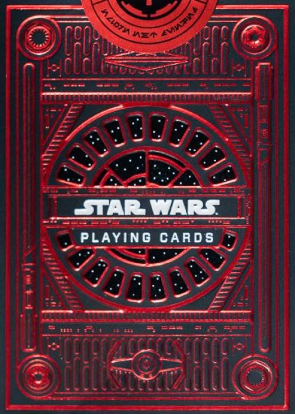 Across the red back design, it's all about the details - from the Death Star to the First Order, Sith, and Empire insignia. In the center, a repeating pattern of TIE fighters supports Darth Vader's light saber on either side.