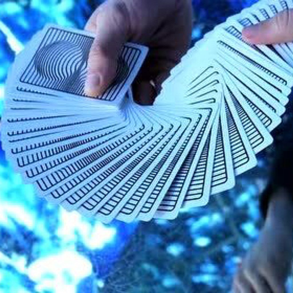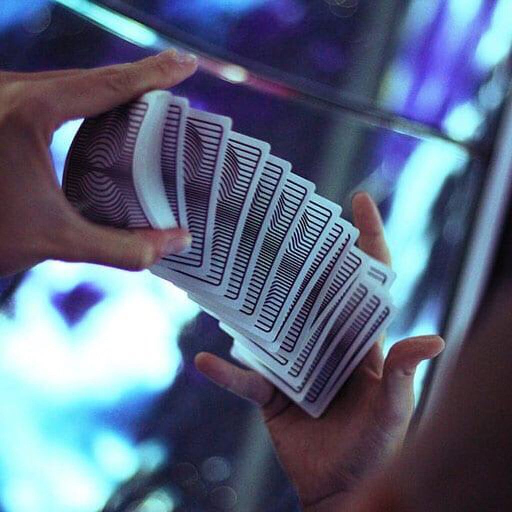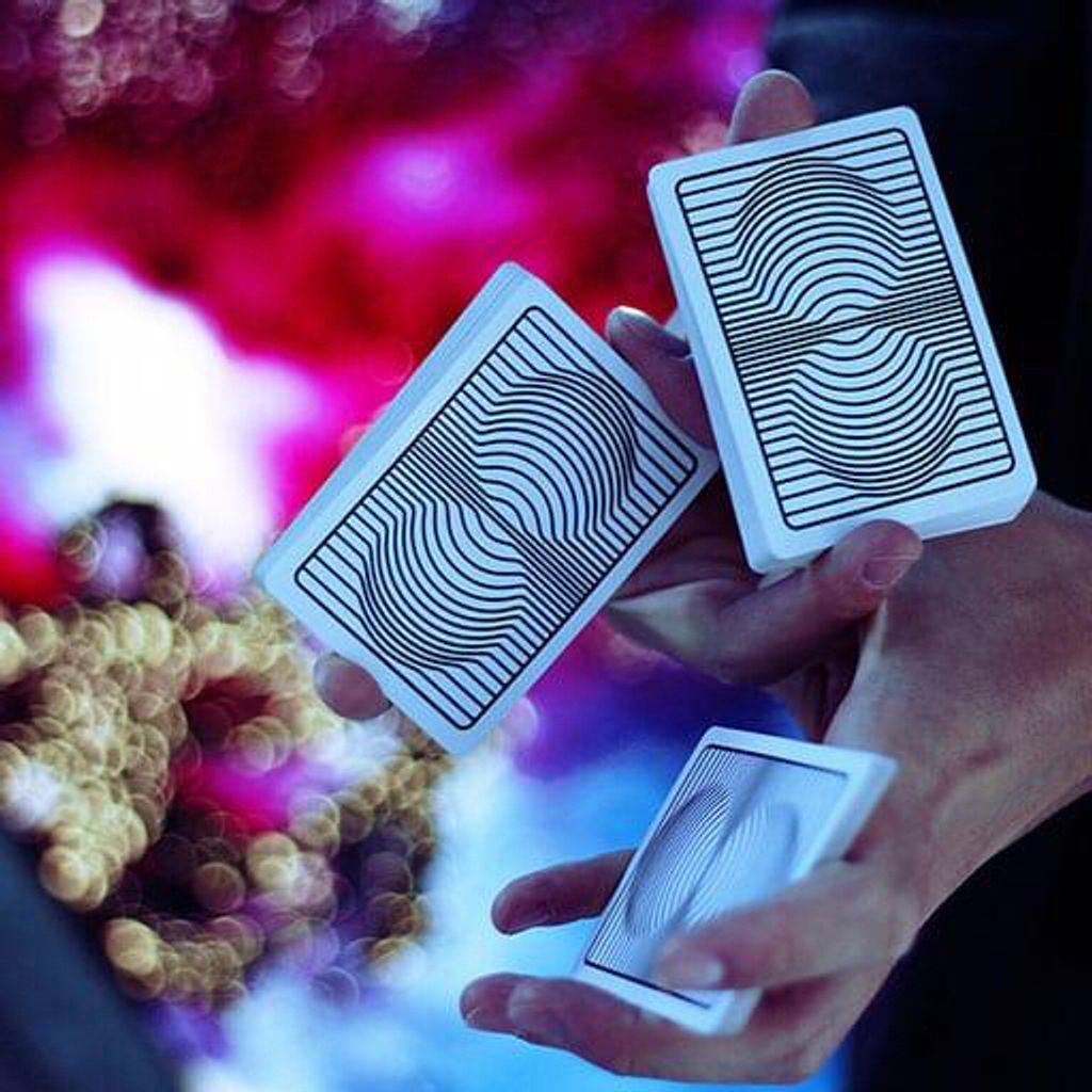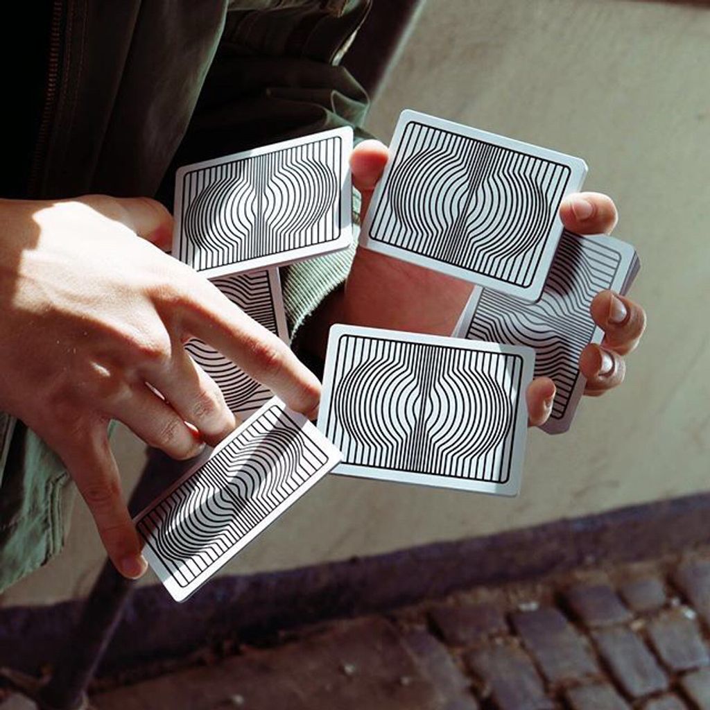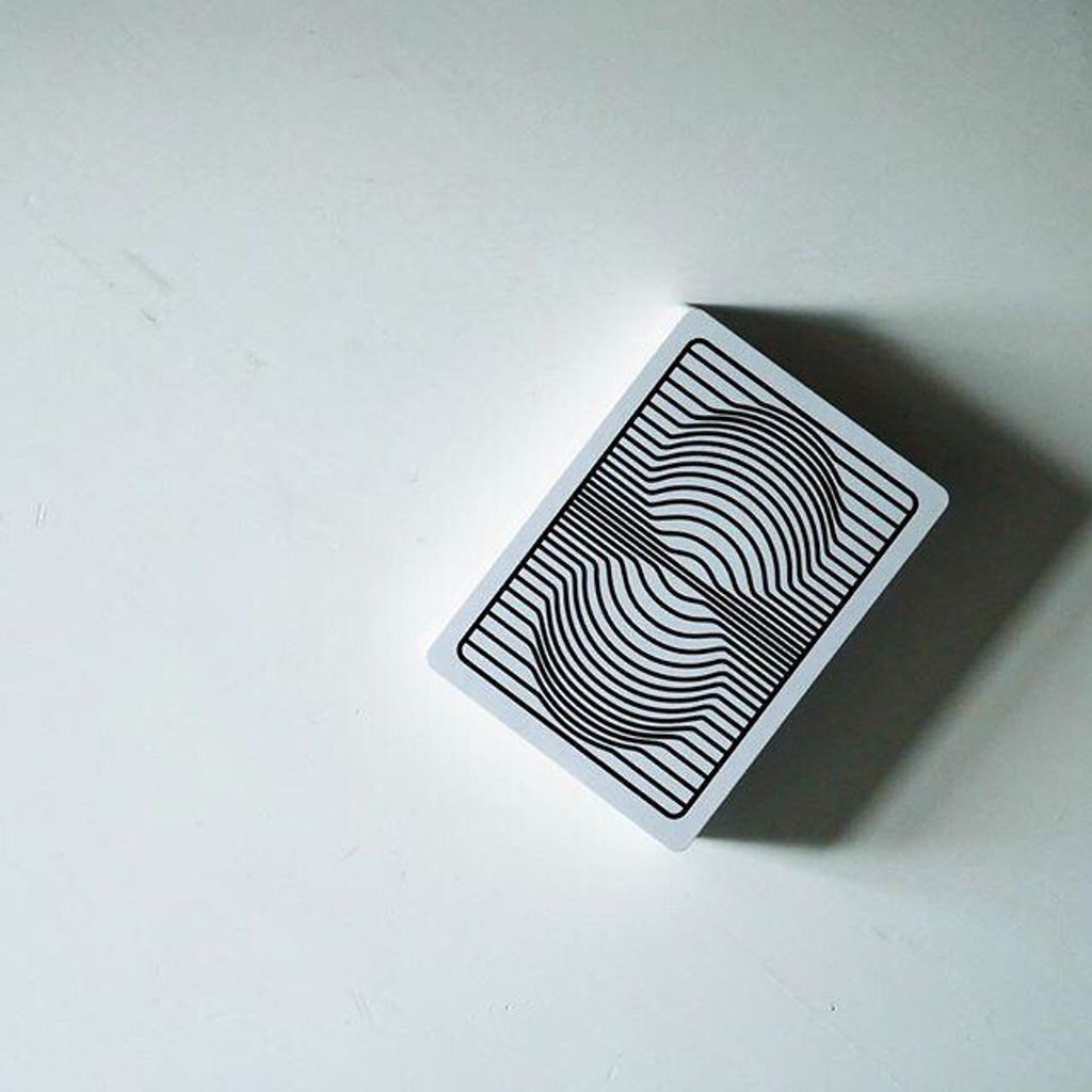 A minimalistic deck of playing cards by Dealers Grip featuring a three-dimensional optical illusion formed by curved stripes.