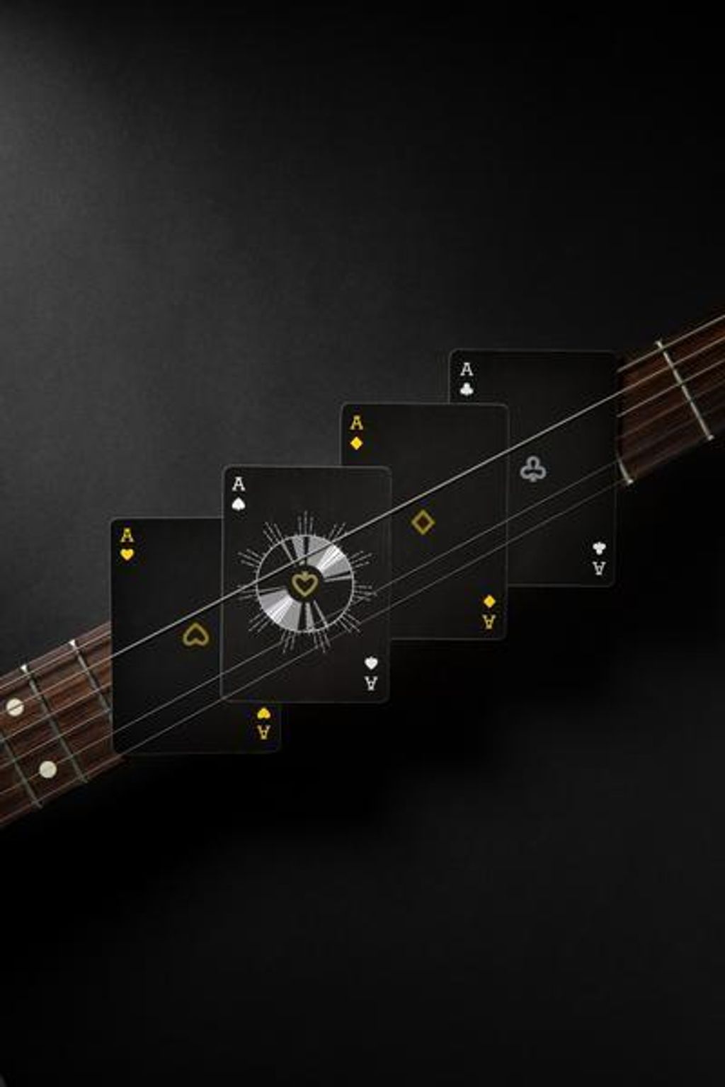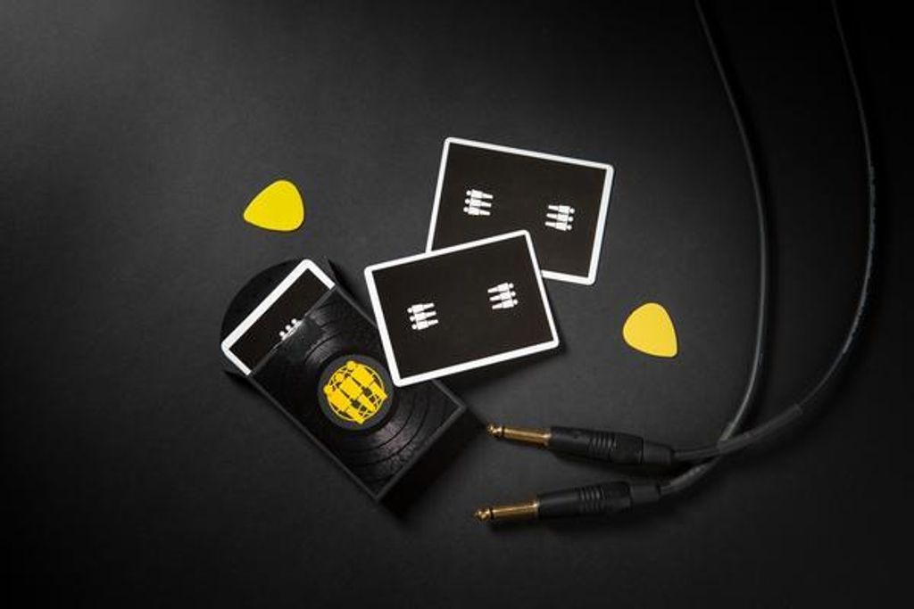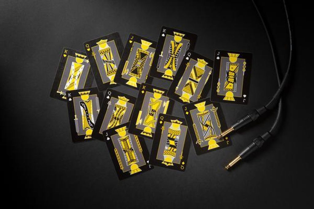 The cards feature a minimal casino-style back -design and an all black background for the face-cards with yellow, grey and white accents throughout the deck.