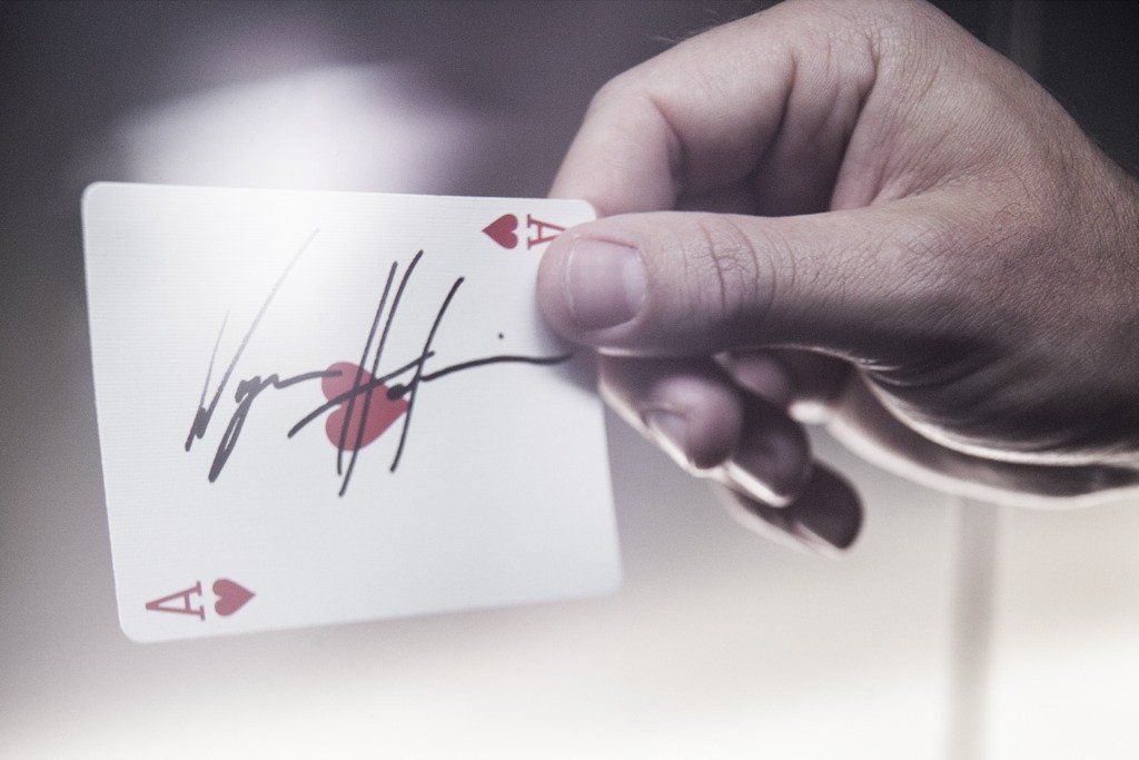 Your spectator is asked to select and sign a card at random. Their signed card is folded and held securely between their lips. You select a card as well, sign it, and place it in your mouth. Somehow, impossibly - the cards switch places. Your signed card ends up in their mouth. Their signed card ends up in your mouth.