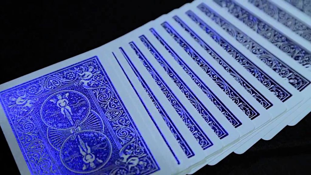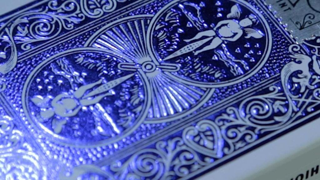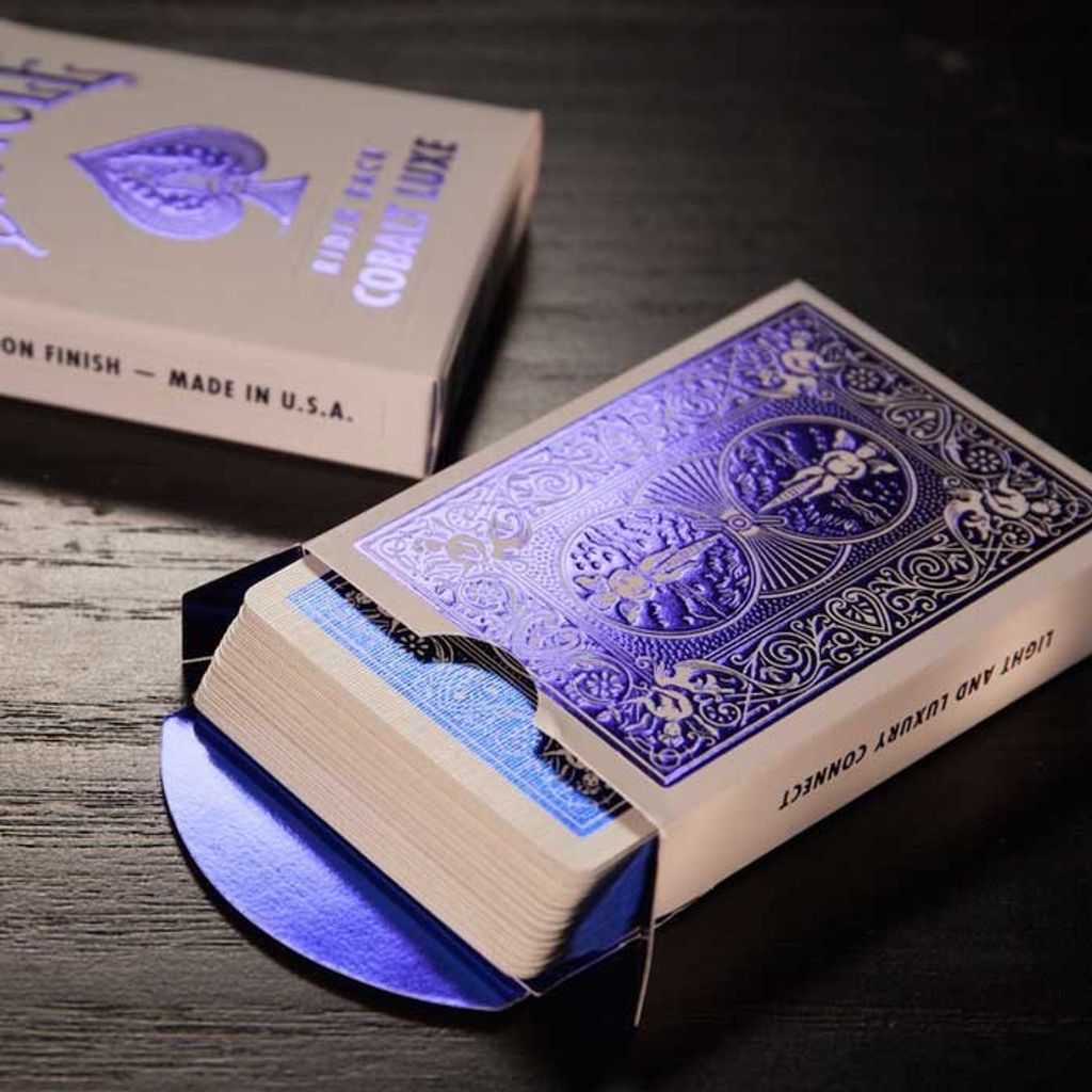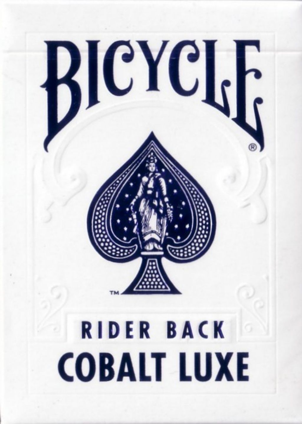 Using a premium matte white cardstock, the tuck case showcases the standard Rider Back tuck case design through subtle embossing and debossing in the cardstock. The tuck case also features embossed elements of vibrant Cobalt MetalLuxe technology, including the Bicycle logo, Goddess of Liberty Spade, card back design and other deck information around the edges of the tuck. The inside of the tuck features a fully-coated, luminous Cobalt MetalLuxe finish.