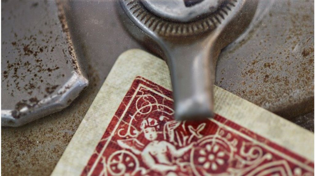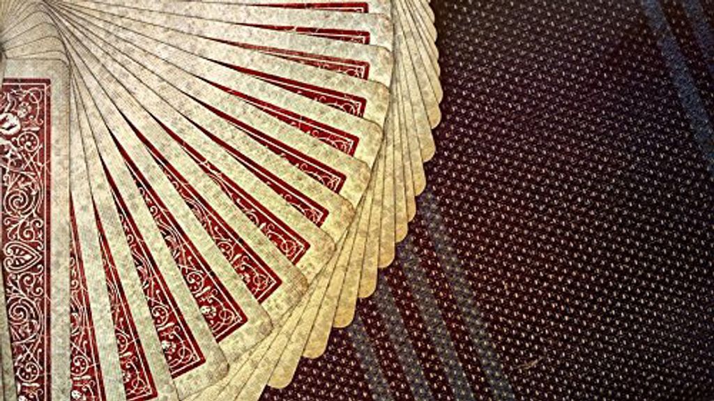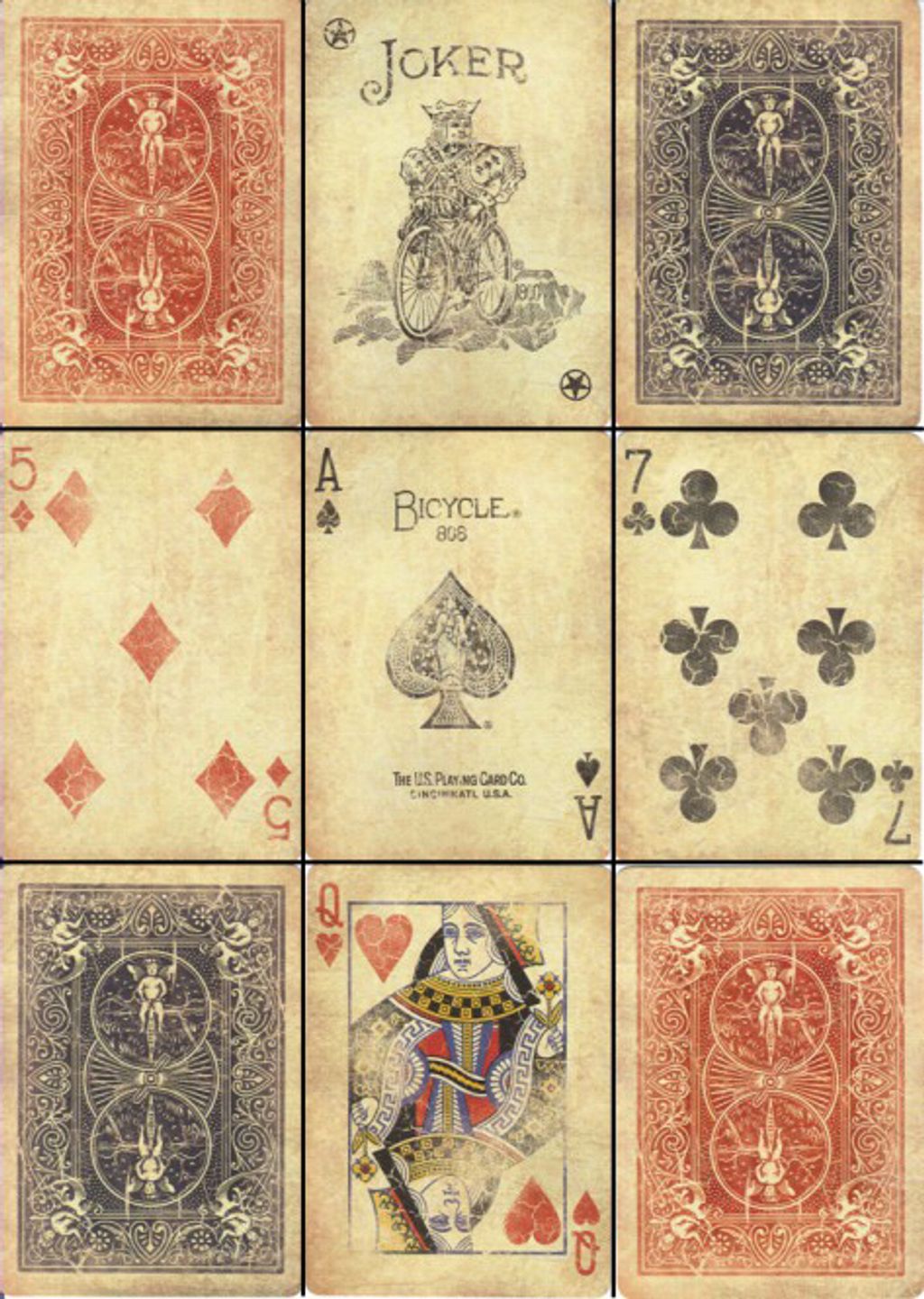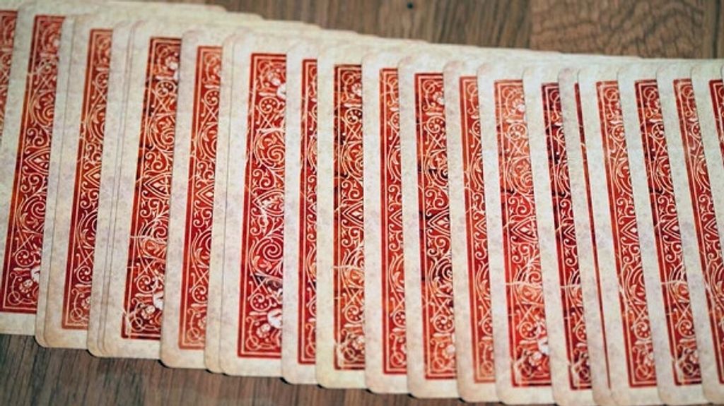 Looking like regular Bicycle Rider Backs that have been withered by time, the "artwork on each card was delicately hand-crafted by Ellusionist's top graphic team". Apart from the old look and details, they have standard Bicycle faces, including the 2 Jokers and the Ace of Spades. The box features a bar-code reveal.
