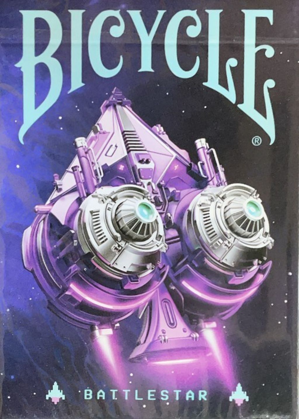Battlestar is set in an intergalactic universe. Mankind has reached the stars and is now facing other alien races in a battle to conquer other planets. The deck is heavily influenced by pop culture and gaming references such as Dune, Star Realms, Miner Wars 2081, Battlestar Galactica, Endless Space, Eve online, just to mention a few. Unique design, modern theme and vibrant colors that jump from the card and simulate a 3D glowing effect. Battlestar is definitely a great deck for collectors and players.Bicycle Battlestar (Purple Seal) (Royal Gilded) Playing Cards
