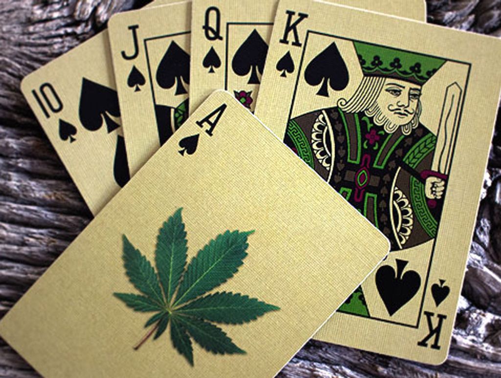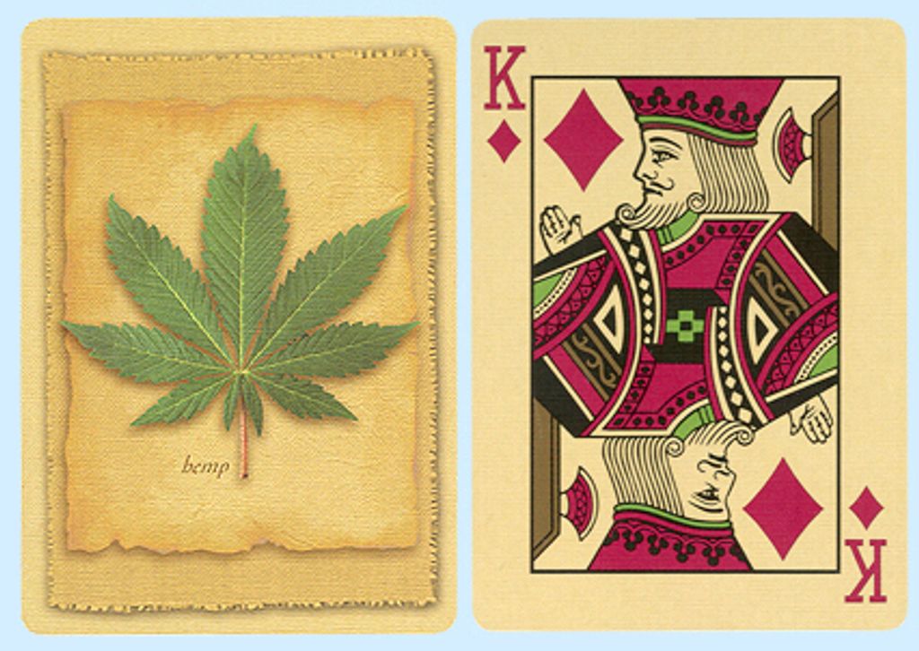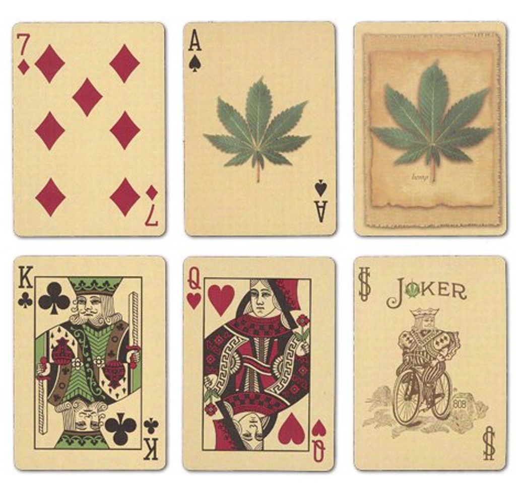 The Bicycle Brand Hemp Deck features a distinctive hemp leaf design on the tuck and the card backs.