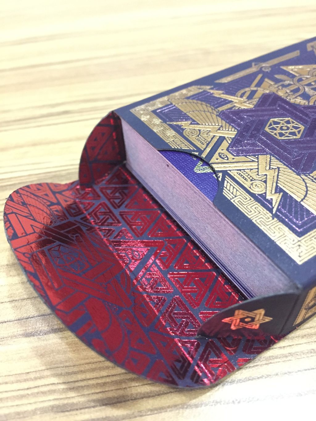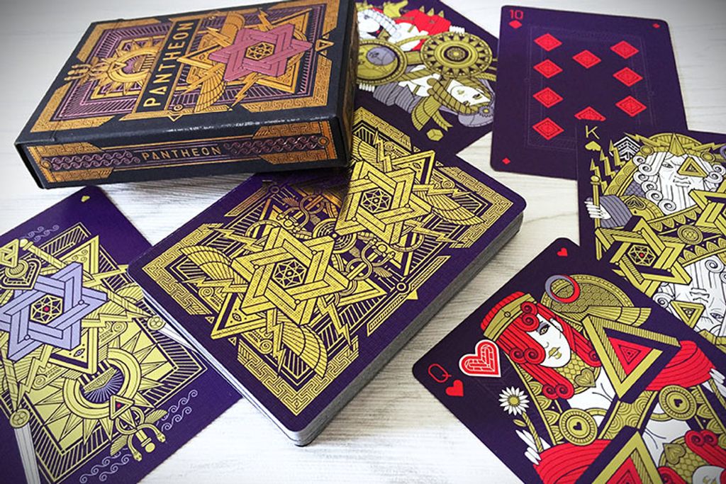 Pantheon is a limited deck from Thirdway Industries, with a luxurious tuck box and gold foil on card backs. " I consider it a spin off of Dedalo, and all the court cards are Greek Gods ", said Giovanni Meroni.