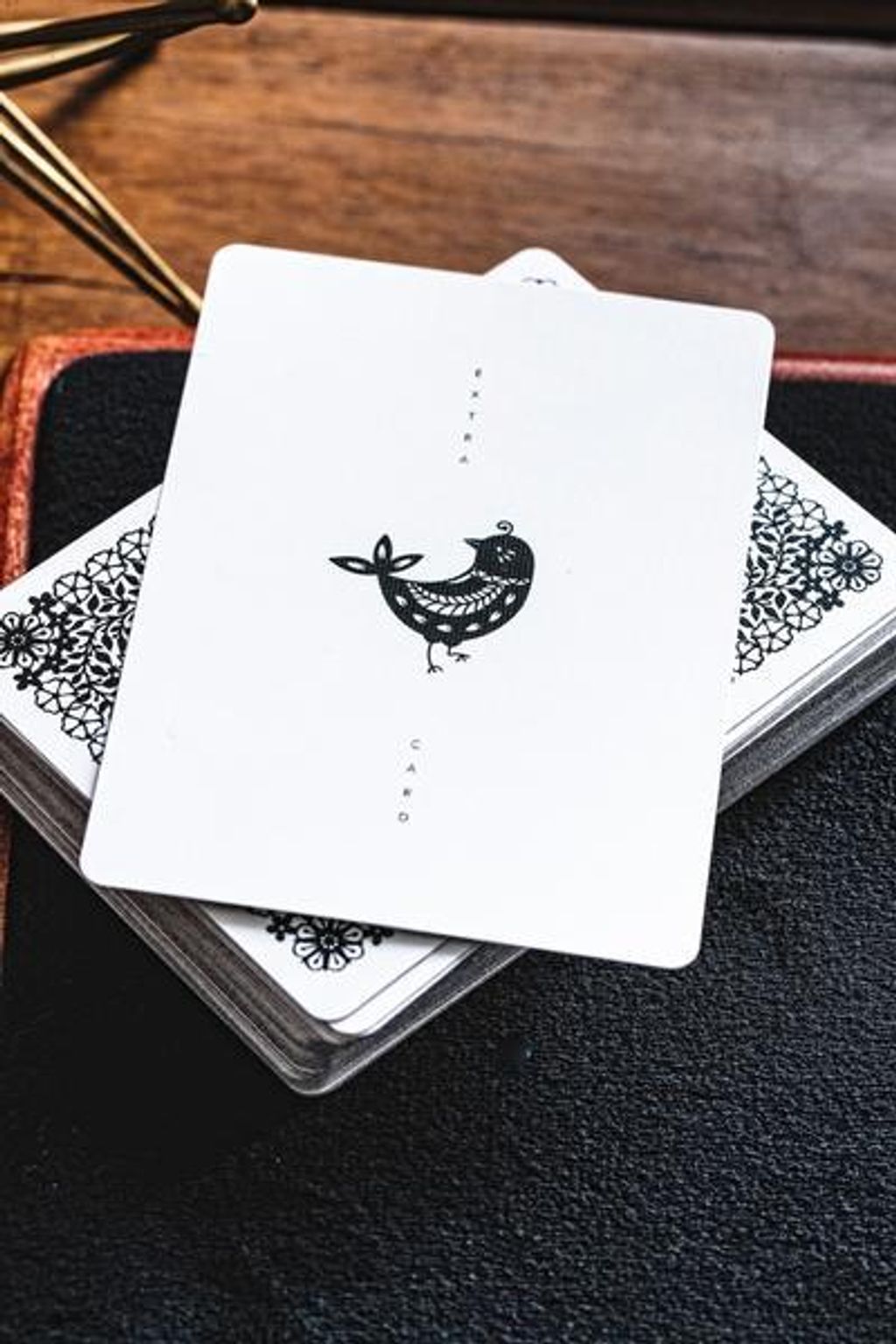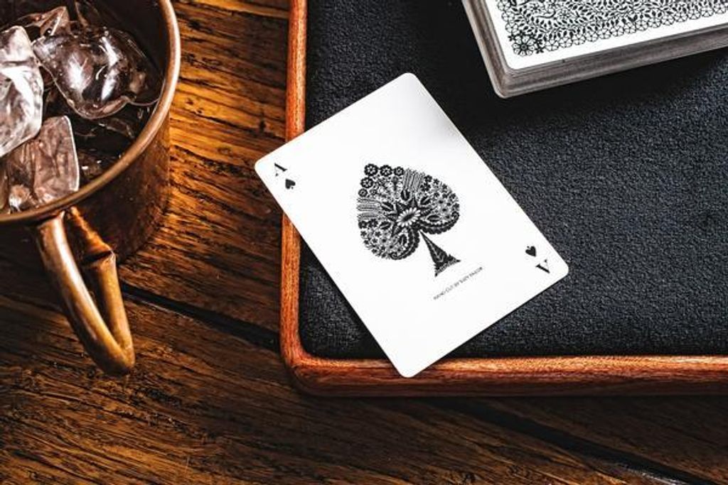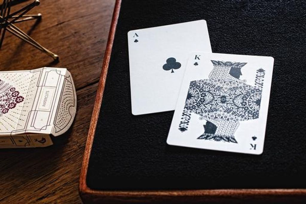 A unique set of playing cards, crafted by hand, through the intricate art of paper cutting.